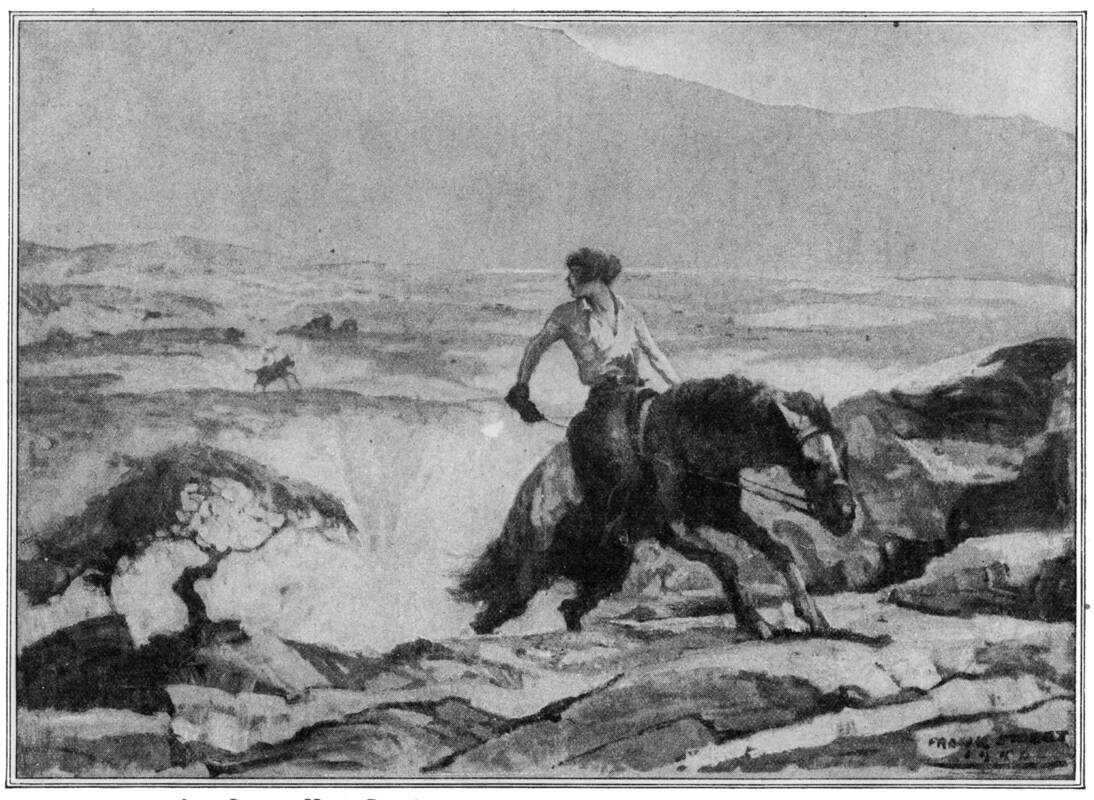 She rode fast until her horse was hot and she was out of breath. Then she slowed down and for the first time she looked back toward the ranch. It was a long way off—ten miles—a mere green spot in the gray. And there was a horseman coming. As usual, some one of the cowboys had observed her, let her think she had slipped away, and was now following her. Today it angered Jane. She wanted to be alone. She could take care of herself. And as was unusual with her, she used her quirt on the horse. He broke into a gallop. She did not look back again for a long time. When she did it was to discover that the horseman had not only gained, but was now quite close to her. Jane looked hard, but she could not recognize the rider. Once she imagined it was Tex and again Andy.