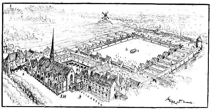 Au moyen âge ces jardins du palais si étendus, enclos de fortes murailles, devinrent le Clos de Laas qu’envahirent peu à peu, en le morcelant, des couvents et des maisons.