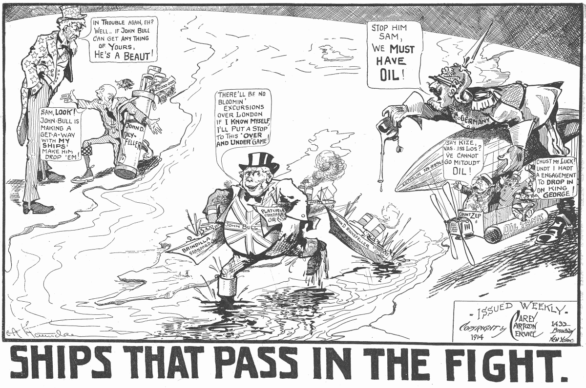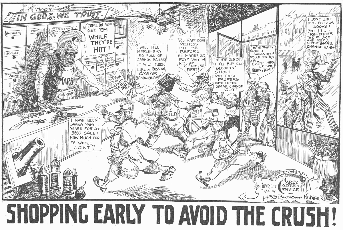 When the European War began, the subject did not appear very promising for cartoons intended for window display owing to the bitter partisan feelings the war engendered in the breasts of many whose ancestors came from one or other of the belligerent nations. Moreover, the President made a strong appeal to all citizens to refrain from unneutral words or deeds. In keeping with the spirit of the proclamation and out of deference to the feelings of very many citizens, absolute neutrality has been sought and maintained in the Carey war cartoons. This is no easy task and we believe that this difficult subject has been treated discreetly and masterfully as well. The cartoons are done in color and the artist has been accurate in his portrayal of the character and traits of the monarchs and peoples involved in the titanic struggle. The War being uppermost in the minds of all people at the present time, the cartoons are doubly effective on that account.