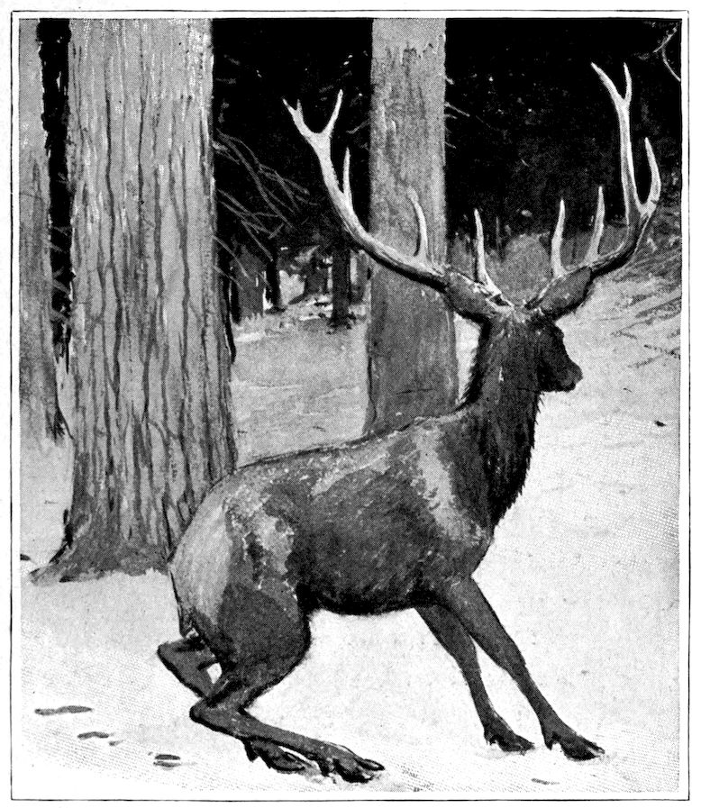 Great was his astonishment when he saw me. He pulled up so suddenly to wheel round that he almost fell on his side; then off he went in a plunging gallop of terror; but he was near by, and stepping to one side I covered an opening between two trees, firing the minute he appeared. A convulsive leap showed that the bullet had struck, and after him I went at full speed. In a short time I saw him again, walking along with drooping head, and again I fired into his flank; he seemed to pay no attention to the shot, 24but walked forward a few steps, then halted, faltered, and fell on his side. In another second I had placed my rifle against a tree, and was admiring his shapely form and massive antlers.
