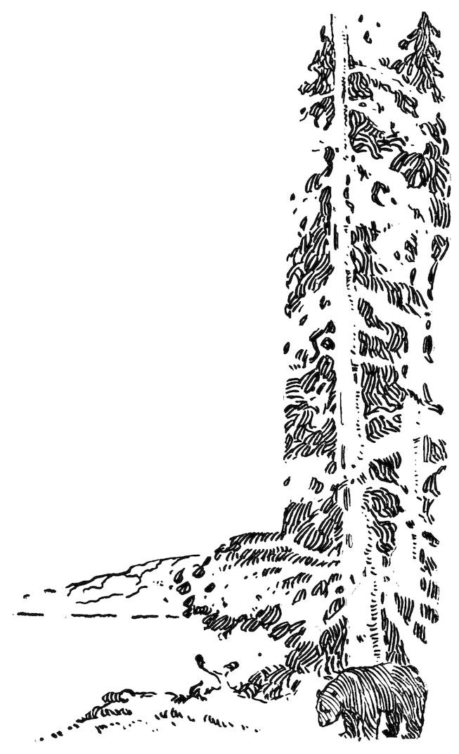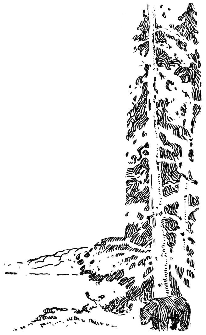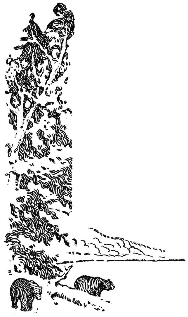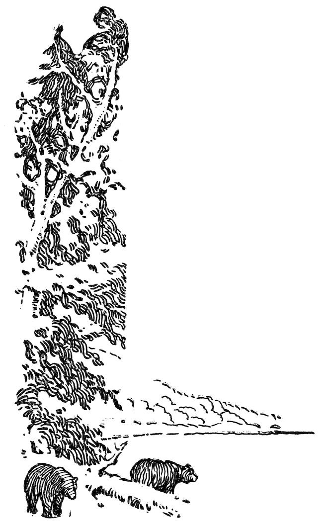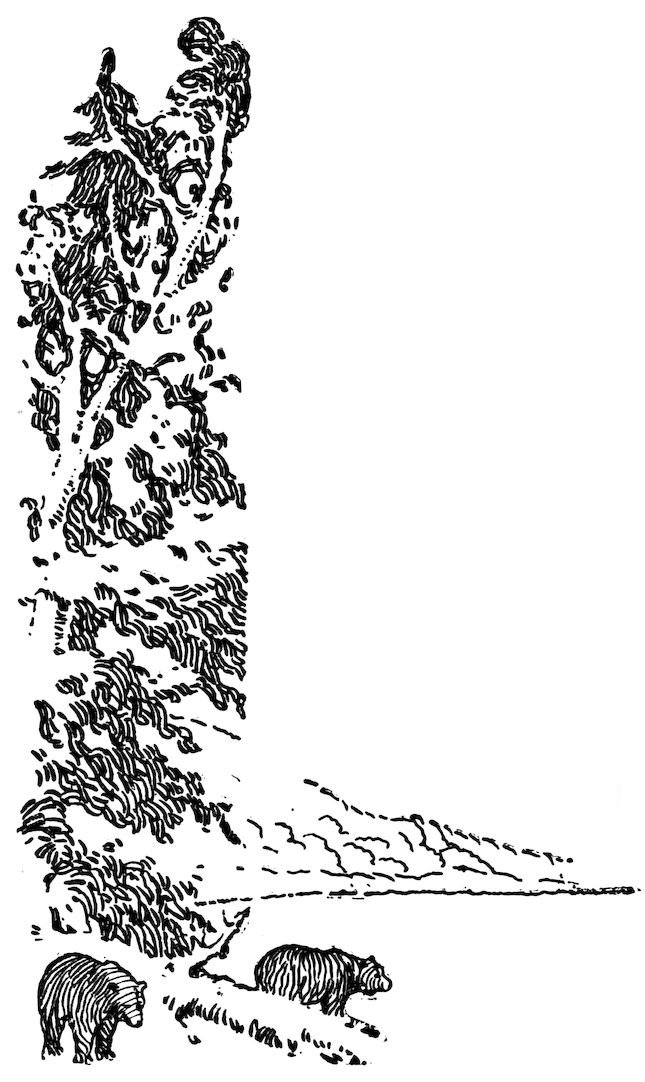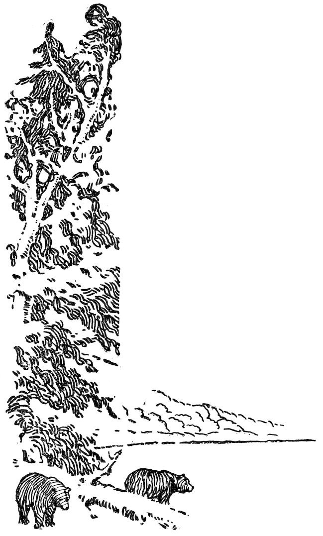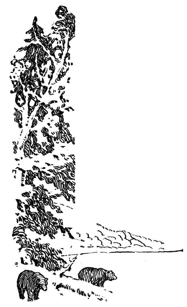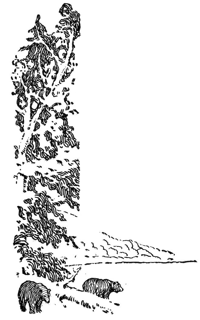 Usually the bears live almost exclusively on roots, berries, insects, and the like. In fact, there is always something grotesque and incongruous in comparing 30the bear’s vast size, and his formidable claws and teeth, with the uses to which those claws and teeth are normally put. At the end of the season the claws, which are very long in spring, sometimes become so much blunted as to be tender, because the bear has worked on hard ground digging roots and the like.