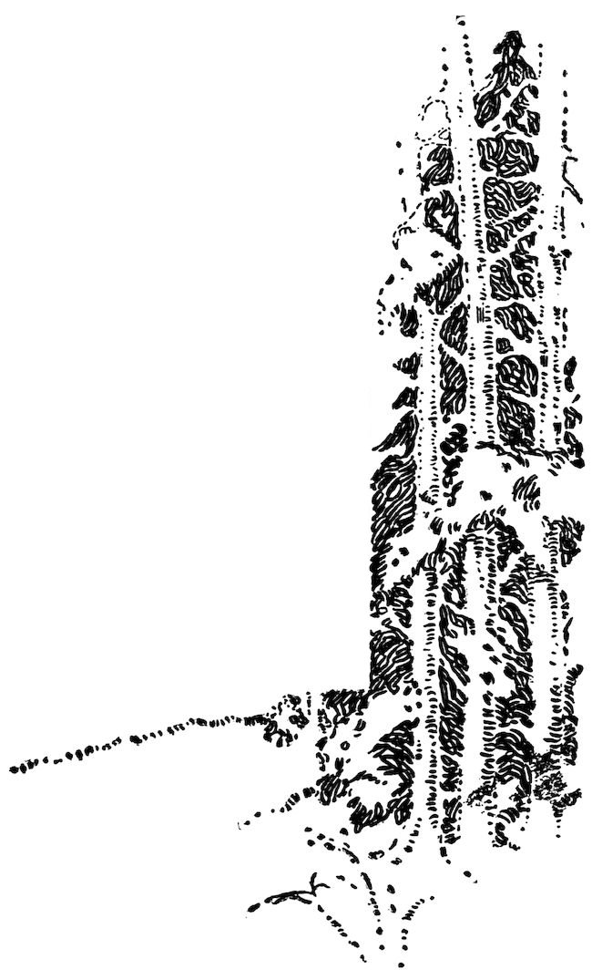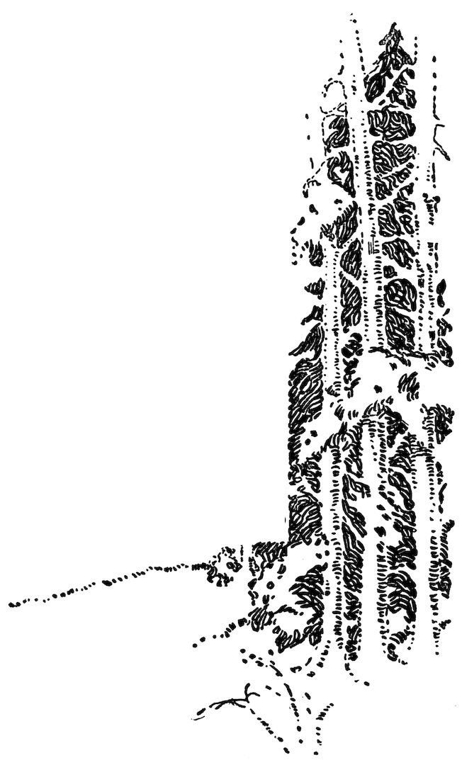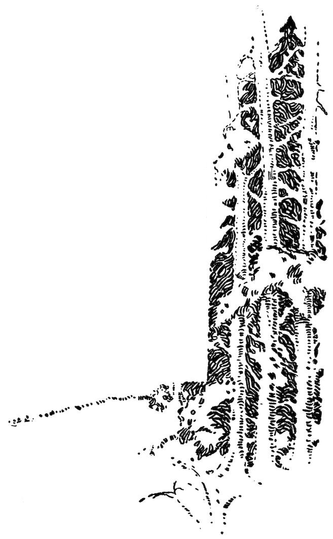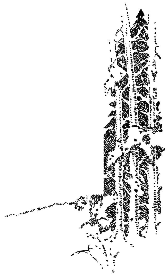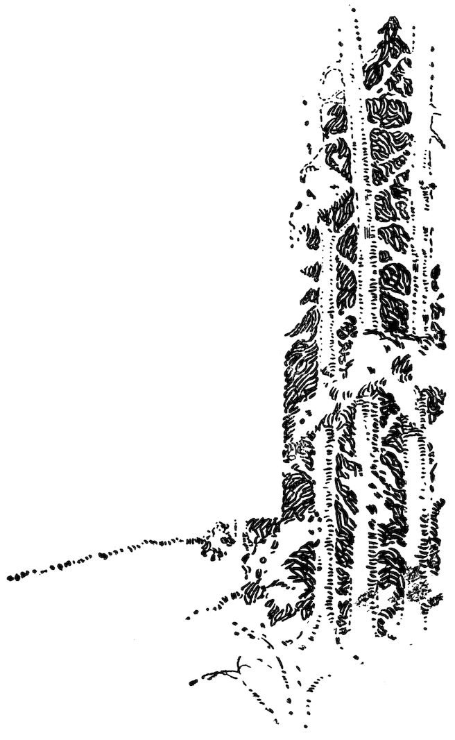 Looking at my watch, I saw that it was nearly dawn. I returned to the tent and laid down as I was under the blankets, and shivered and dozed for half an hour, then I came back to the meadow, where the pack-ponies stood motionless. In the brightening light the moon paled, and I was very soon able to pick out the bull’s trail on the frost-covered ground, where it was almost as plain as if he had been walking in snow. I saw that he had struck up a long valley, from which a pass led into a wooded basin. At the top of the pass I lost the trail entirely, and as it was almost impossible to see for any distance through the woods, I came to the conclusion that the best thing to do was to sit down and await events.