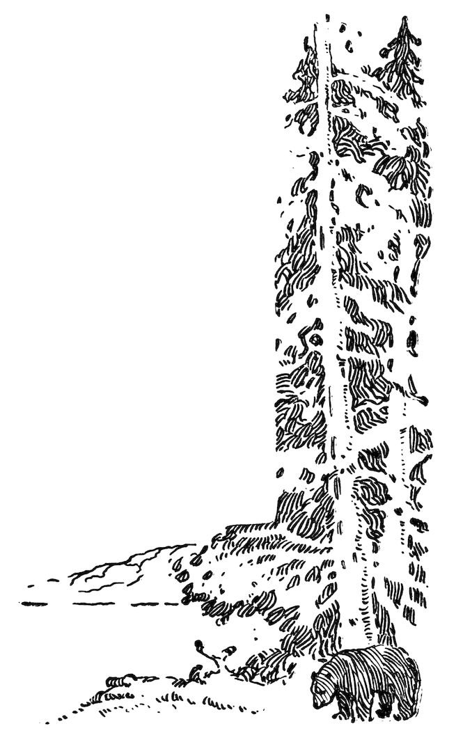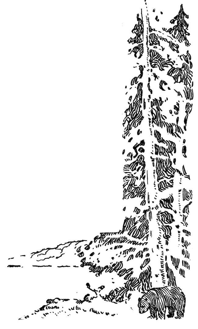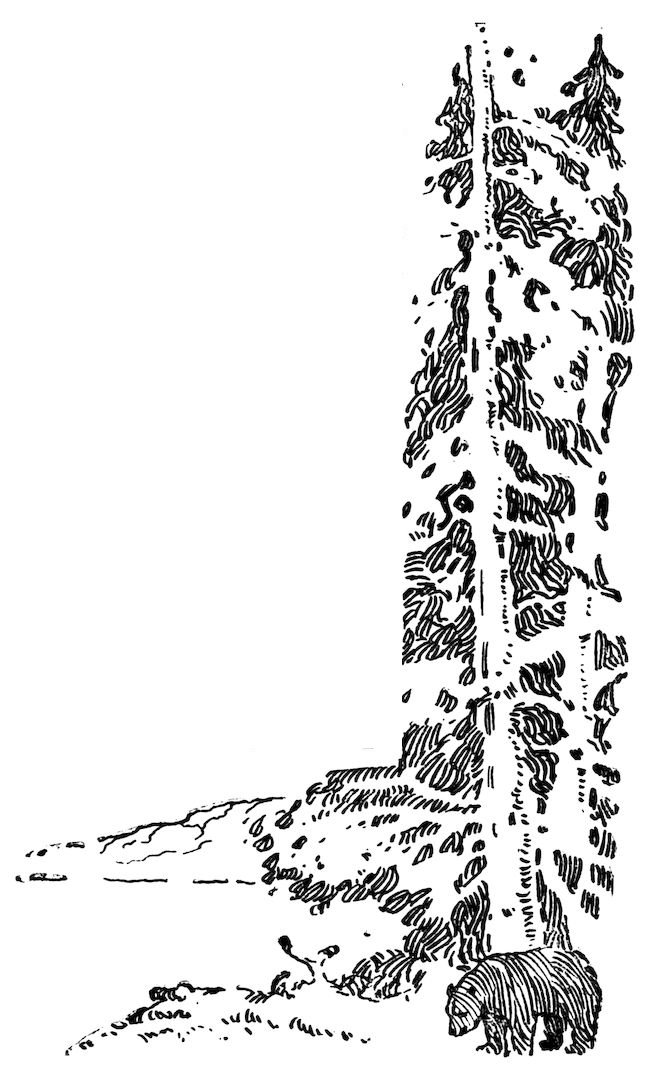 Besides roots and berries, the bear will feed on any small living thing he encounters. 31If in plundering a squirrel’s cache he comes upon some young squirrels, down they go in company with the hoarded nuts. He is continually knocking to pieces and overturning old dead logs for the sake of devouring the insects living beneath them. If, when such a log is overturned, mice, shrews, or chipmunks are found underneath, the bear promptly scoops them into his mouth while they are still dazed by the sudden inrush of light. All this seems rather ludicrous as the life work of an animal of such huge proportions and such vast strength.