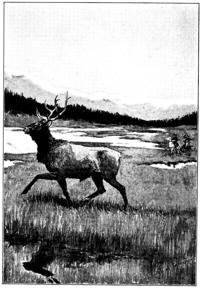 The wapiti is rather easier to kill than the deer, because his size makes it easier to see him; and he is slower in his movements, so that he is easier to hit. When pressed he can gallop very hard for a few hundred yards, but soon becomes tired. The trot is his natural gait, and this he can keep up for hours at a time, going at a pace which makes it necessary for a horse to gallop smartly to overtake him, 17and clearing great logs in his stride, while he dodges among the thick timber in a really marvellous way, when one comes to think of the difficulty he must have in handling his great antlers.