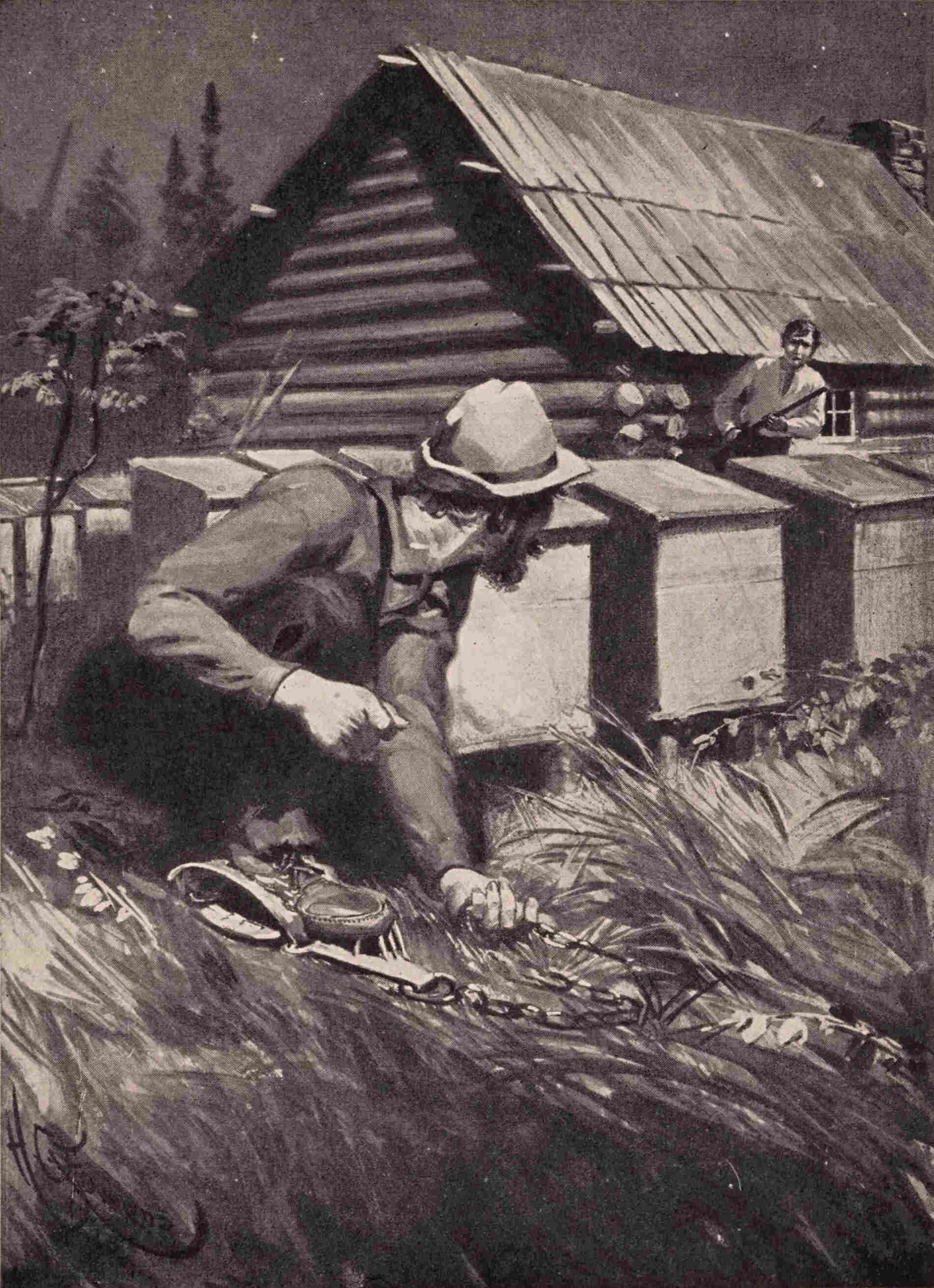 “Voila!” said the half-breed, contritely. “It was one rotten treek. But, you see, you catch me in bear trap. Your bees sting my cow, kill my hen, sting my dog, sting me mos’ to death. So I see ze bee-boxes up there all alone, and I say, ‘He sting me no more, by gar!’ So I light fires—here, dere, many places at once.”