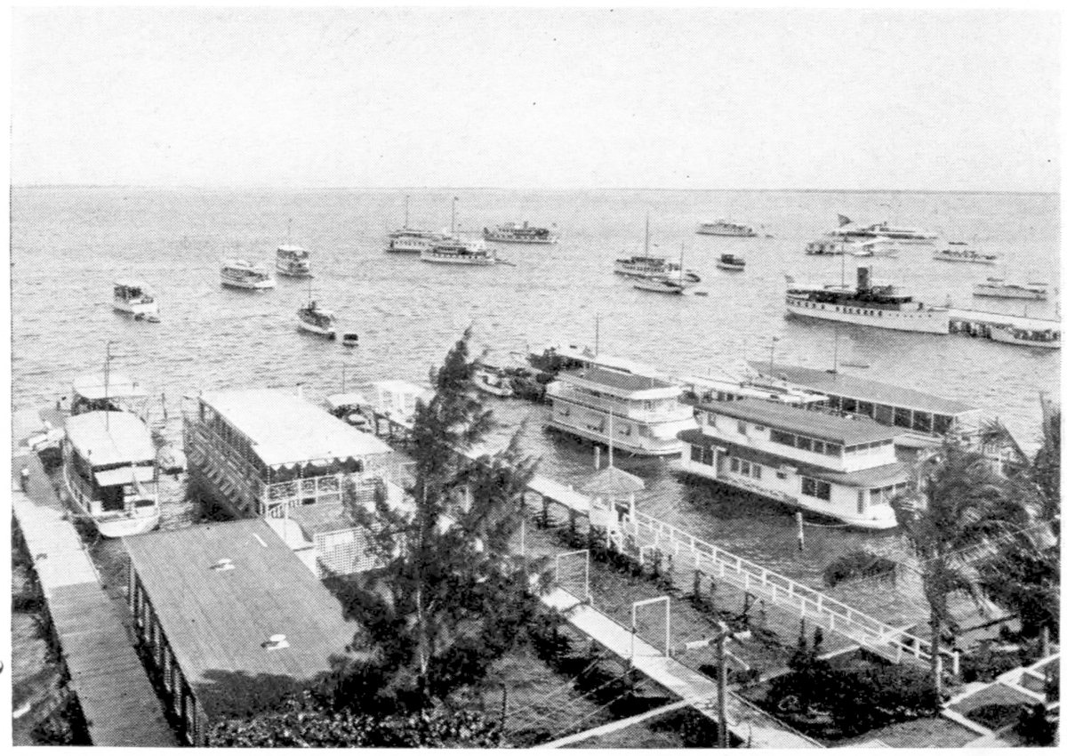 Private yachts and house-boats tied up at the foot of Miami’s principal shopping street.