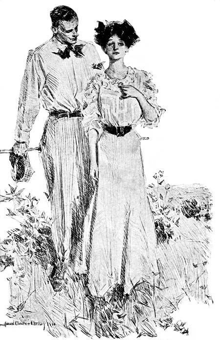 [327]Upon the hill-top they found great banners of purple and gold waving before their eyes against a background of blue and green. Below them the verdure of the rolling fields and maple clumps were also tinted with gold. The air was soft, and yet it sparkled as though fine gold were being sifted down from above. A wonderful world, and they two stood alone in it. Populous cities subsiding their turmoil; men and women going about the ordinary routine of their lives; ships putting to sea and men being carried to hospitals—all those things there might be for others outside the circumference of their eyes, but to them mere phantasies, pleasant and unpleasant. They stood alone here and the fact of grappling kingdoms and great deeds elsewhere were but the tawdriest distant incidents.