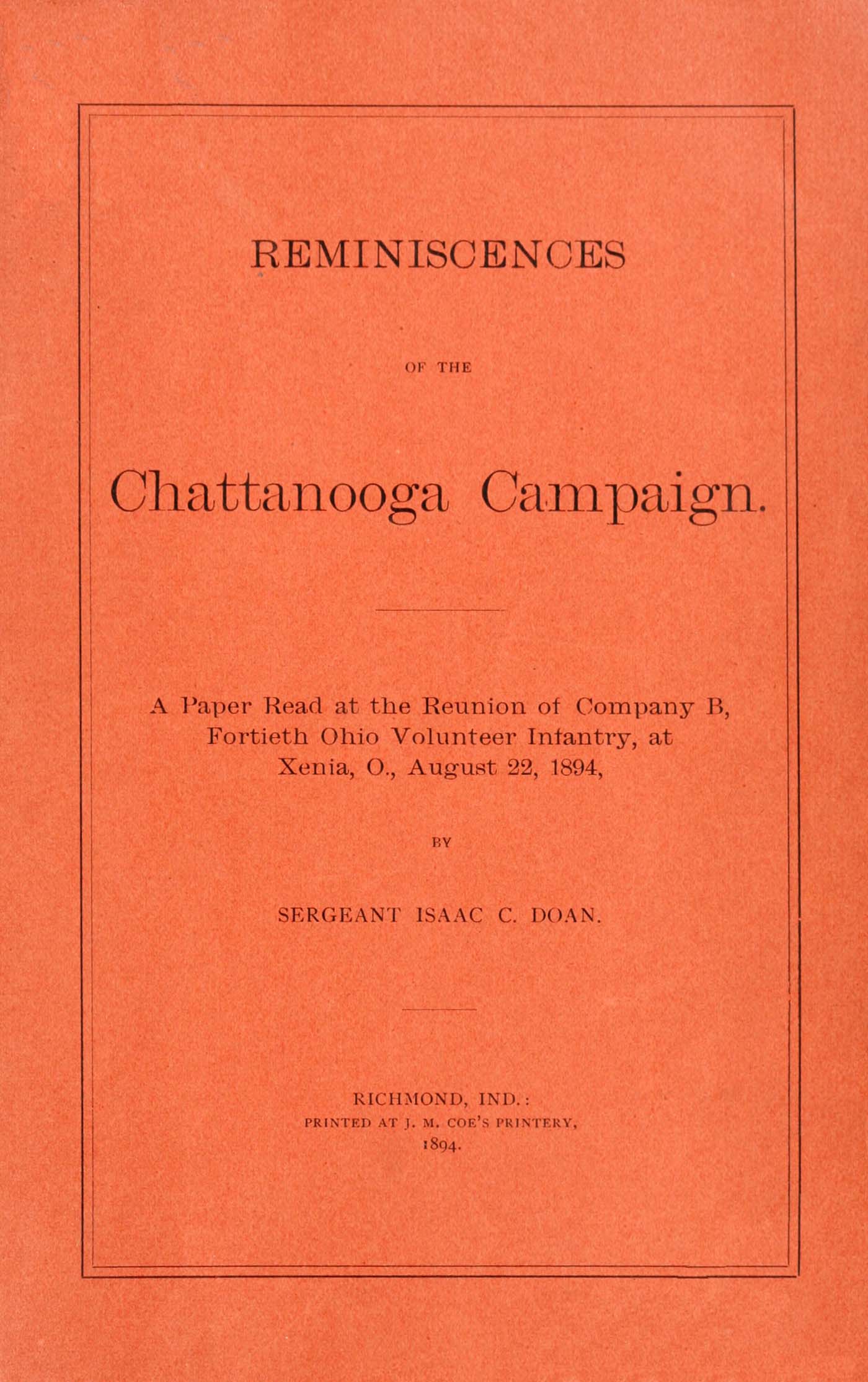 The east and south bounded by the majestic crescent of Missionary Ridge, buttressed upon the west by the cloud-hung battlements of Lookout Mountain, clad in the variegated paraphernalia of autumn foliage; the whole softly illuminated by the mellow radiance of an Indian summer day, presented a picture that may be treasured in the memory as one of nature’s masterpieces.