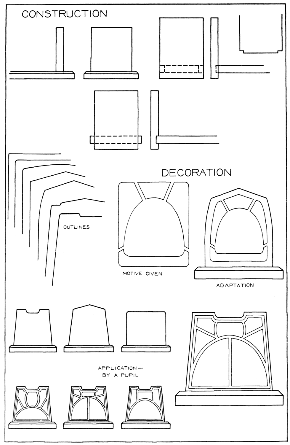 Our outline will aim to present the work so as to meet the conditions specified above. It has been thoroly tested over a period of years in public school work. It follows the group plan. The advantages of the group system are distinct. It permits class instruction and therefore minimizes the amount of demonstrating and talking that the instructor must do by preventing needless repetition. By grouping a number of projects having similar tool operations it permits a boy to satisfy his individual needs without interfering with the orderly presentation of the subject matter. It provides work for the fast worker of an interesting and profitable nature until the slow worker completes the minimum requirement. It provides for the “repeater,” who often has to repeat, not because of poor work in manual training but because of poor work in academic studies, by giving him choice of different models upon which to work. In general, the group plan possesses the manifest advantages of class instruction at the same time making allowance for the individuality of the worker.