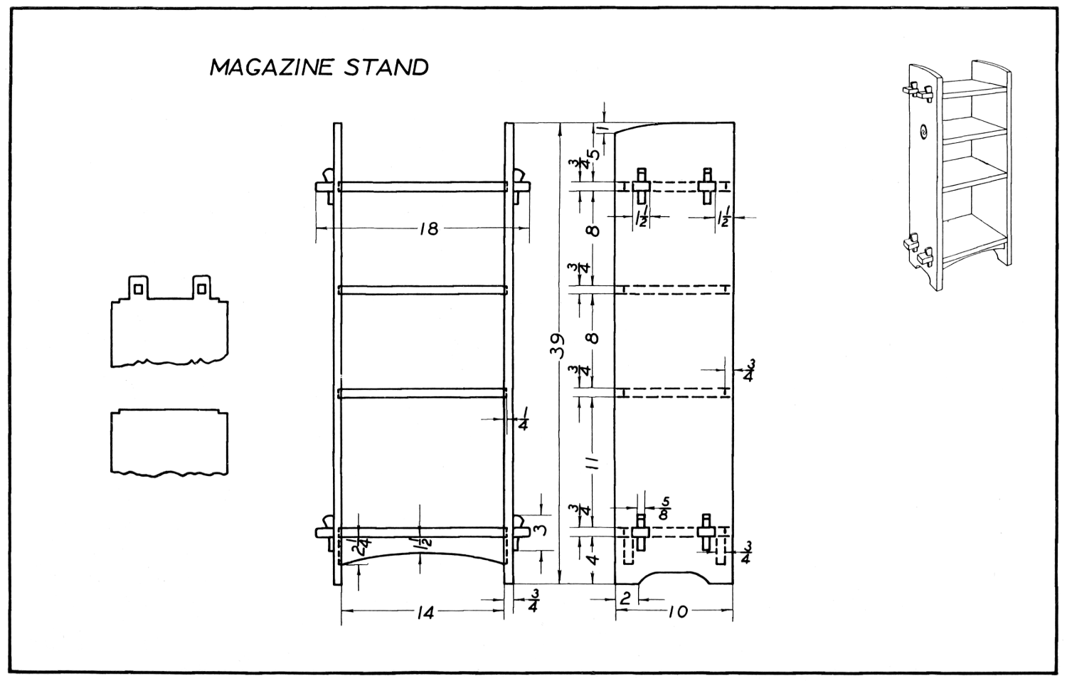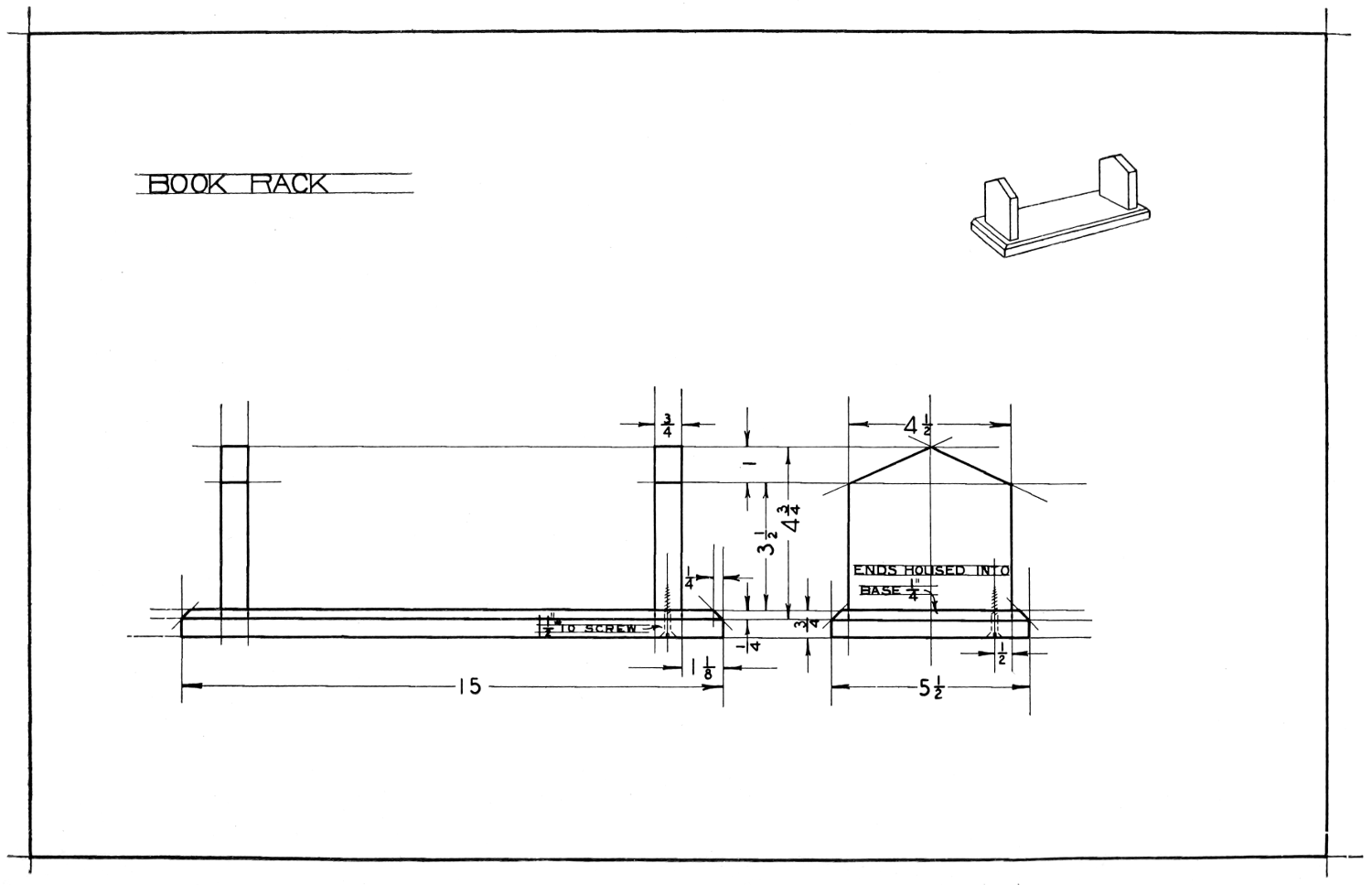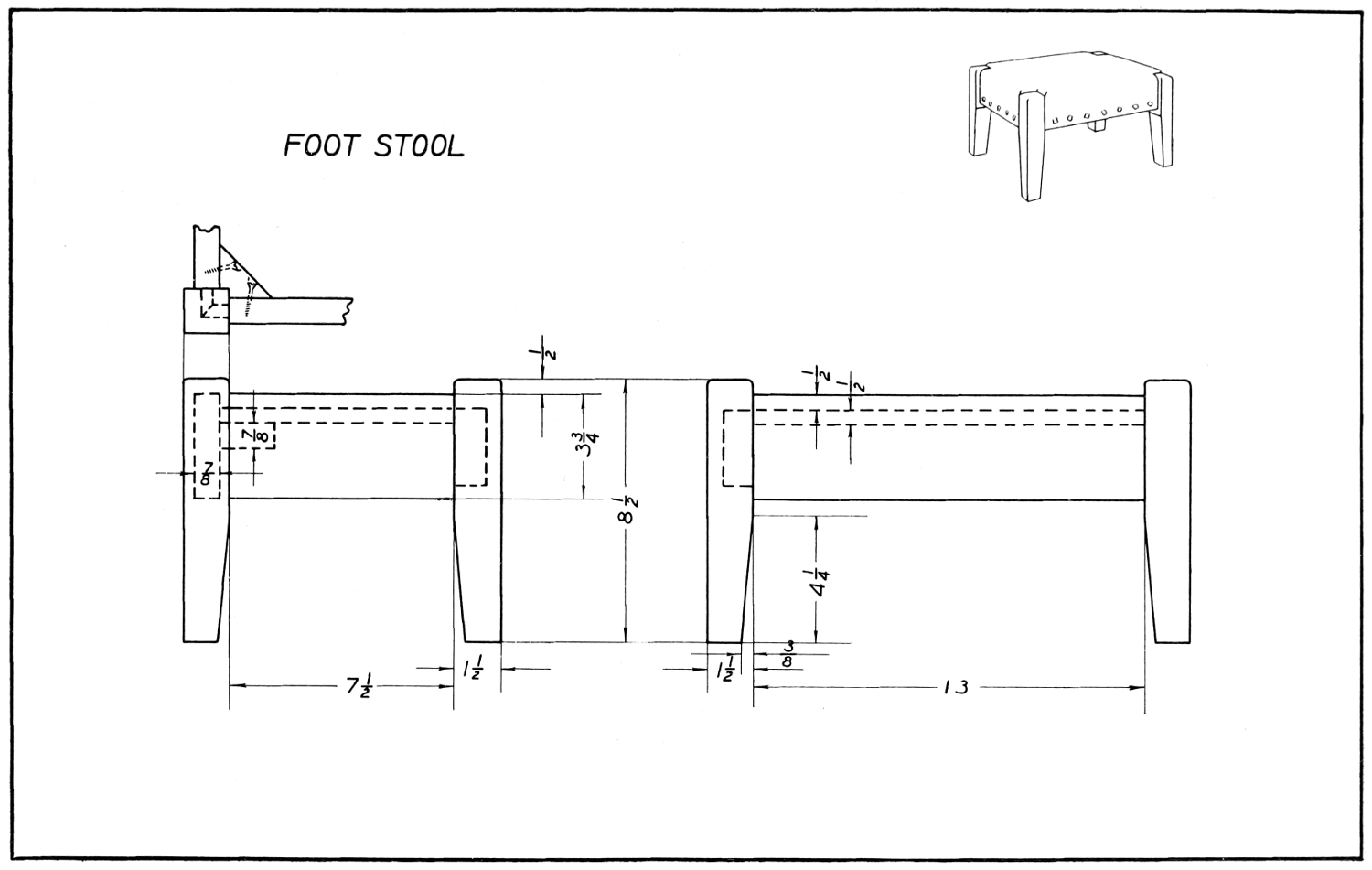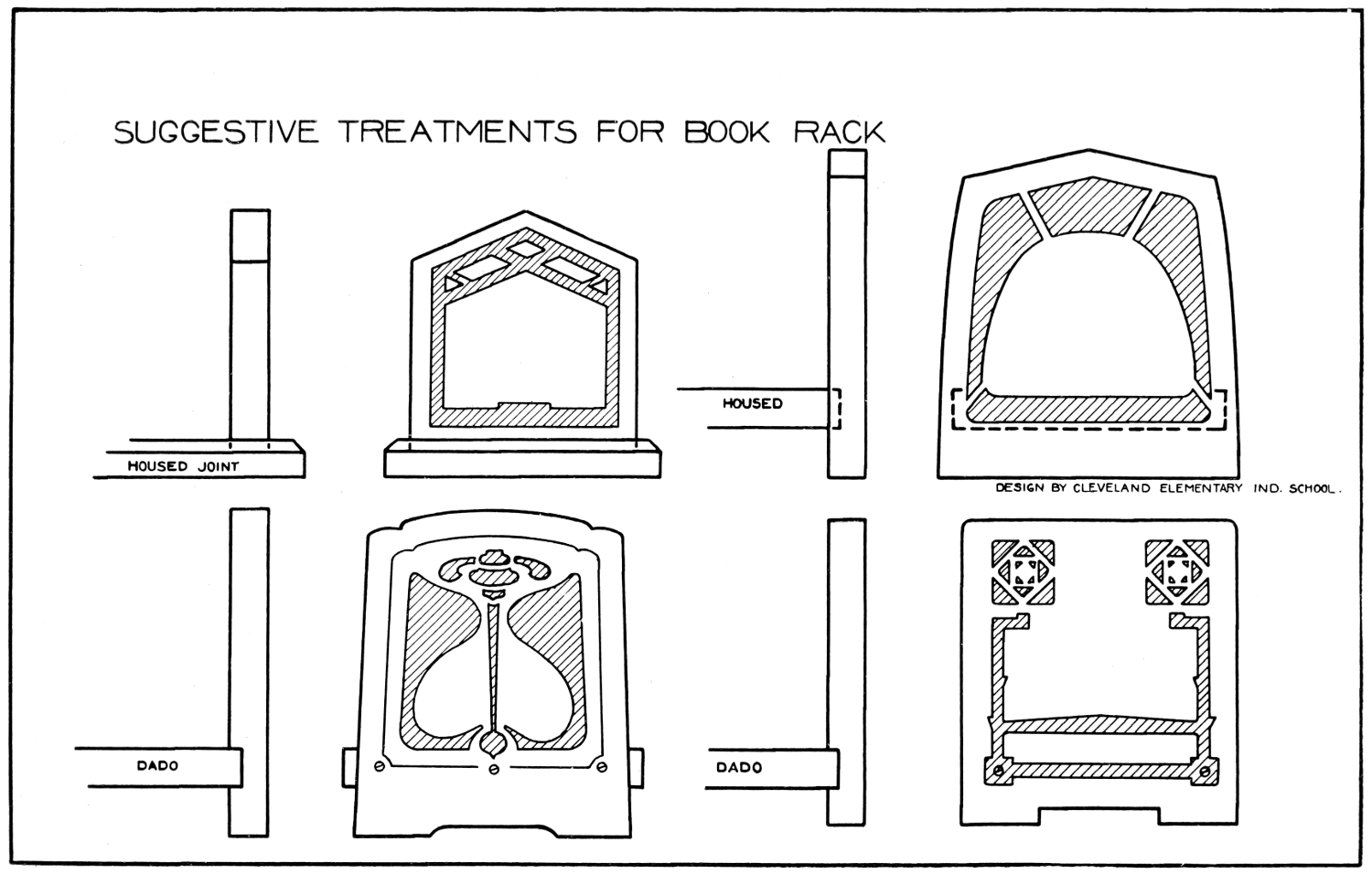 For the convenience of the teachers, the drawings used in “Projects for Beginning Woodwork and Mechanical Drawing” and “Advance Projects in Woodwork” are printed in this book. The notes and working directions, however, are not included. The inking of the drawings and the making of the perspectives in both of these books is the work of Mr. George Gordon Kellar.