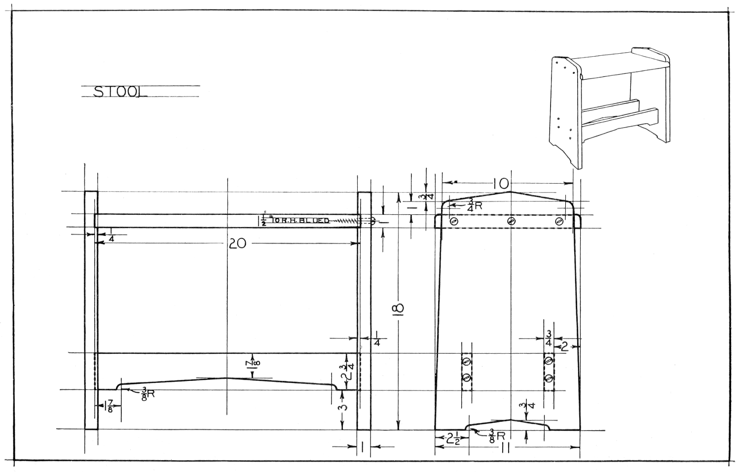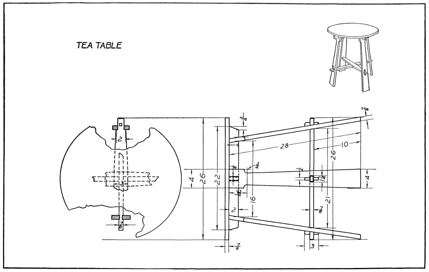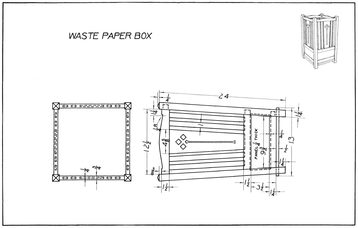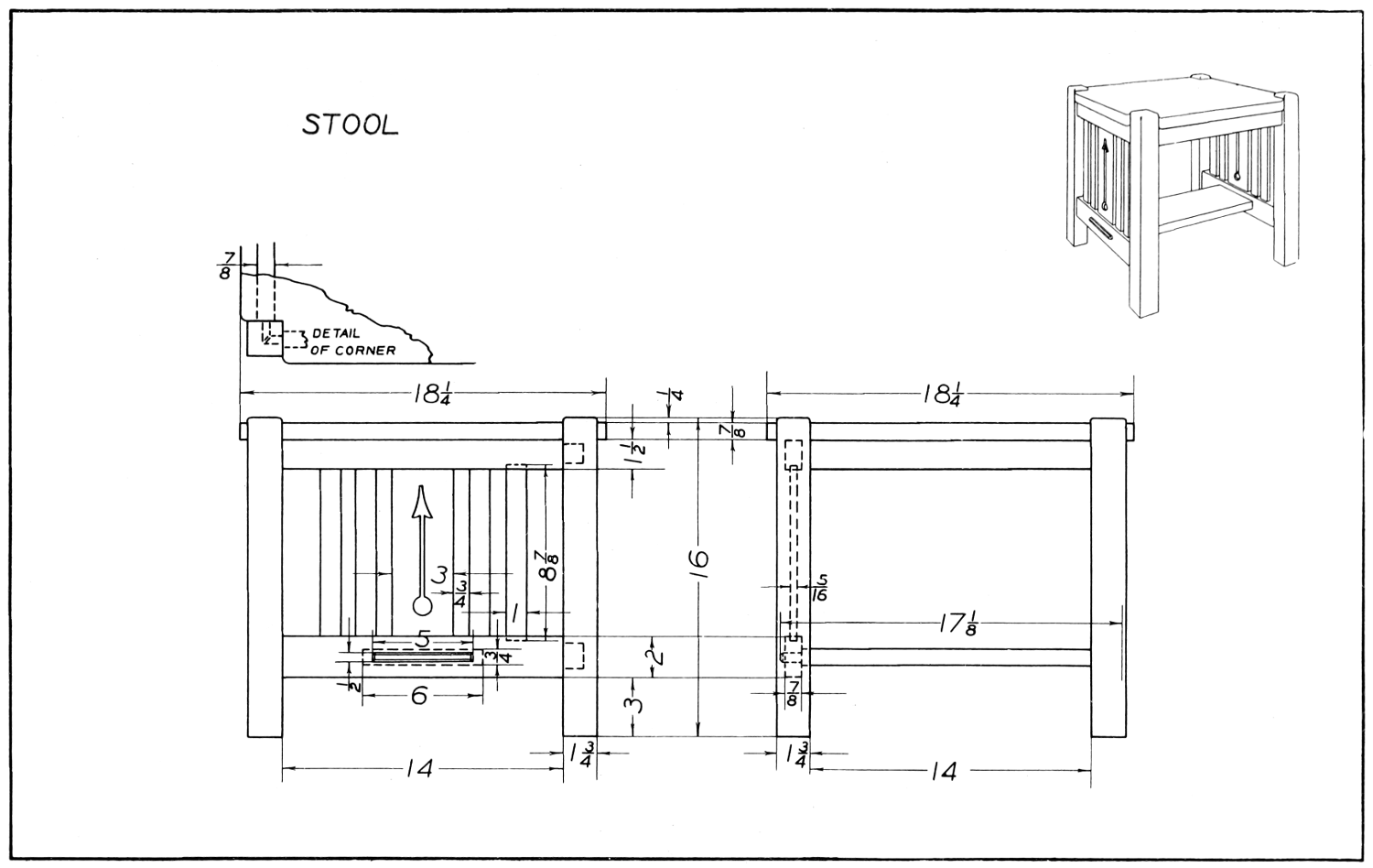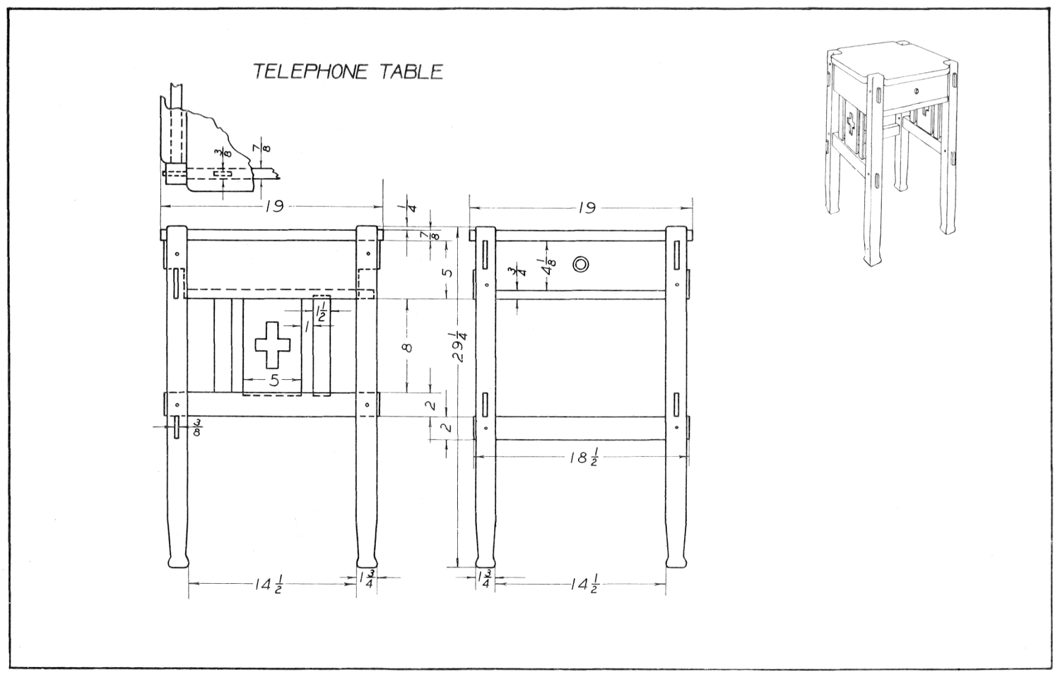 For the convenience of the teachers, the drawings used in “Projects for Beginning Woodwork and Mechanical Drawing” and “Advance Projects in Woodwork” are printed in this book. The notes and working directions, however, are not included. The inking of the drawings and the making of the perspectives in both of these books is the work of Mr. George Gordon Kellar.