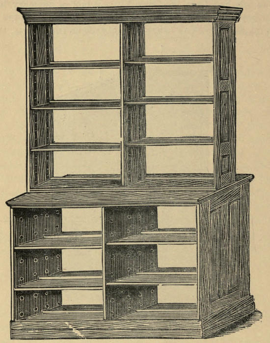 The question of material is very important, but of course it depends altogether upon the amount which is proposed to be spent on the fittings. It is very desirable that the cases should be made durable and handsome, as it is not pleasant to have bad workmanship and ugly fittings in a centre of “sweetness and light”. For the standards previously mentioned there can be nothing better or cheaper than sound American or Baltic yellow pine, with, in reference cases, oak ledges. This wood is easily worked, wears very well, and can be effectively stained and varnished to look like richer and more expensive woods. Of course if money is no object, oak, mahogany, or walnut can be used; but the cost of such materials usually works out to nearly double that of softer woods. Cases with heavily moulded cornices should be boarded over the top, and not left with huge empty receptacles for dust and cobwebs. This caution is tendered, because joiners very often leave the space made by the cornice vacant and exposed.