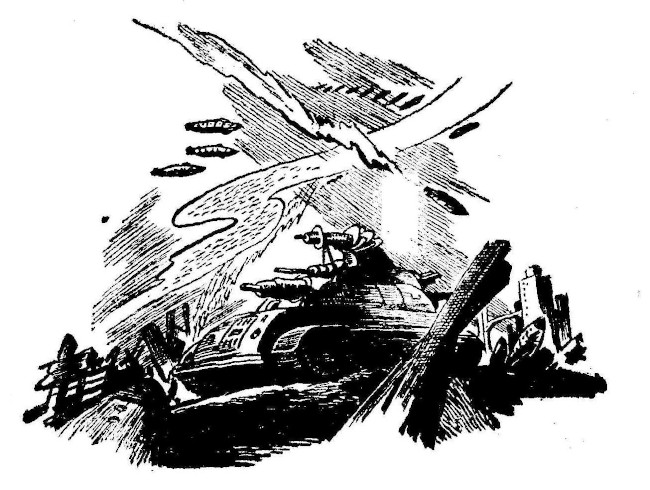 Then the destroyer dropped back, and from the turret there came the angry buzz of the AutoMacs. On the driving fin of the Mardinex appeared an incandescent spot that grew quickly and trailed a fine line of luminous gas behind it. Then the turrets of the Mardinex whipped around and Tim shouted: "Look out!"