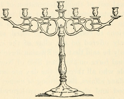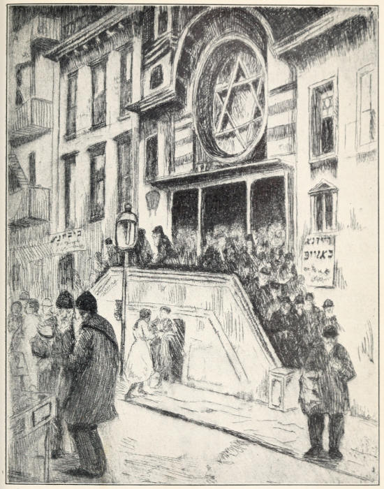 We learned the most efficient use of the fire-escape and felt many times blessed because of our easy access to the roof. We also learned the infinite uses to which stairs can be put. Later we achieved “local color” in our rooms by the addition of interesting pieces of brass and copper purchased from a man on Allen Street whom we and several others had “discovered.”[13] His little dark shop under the elevated railway was fitfully illuminated by the glowing forge. On our first visit the proprietor emerged from a still darker inner room with prayer-shawl and phylactery. He became one of our pleasant acquaintances and lost no occasion of acknowledging what he considered his debt to the appreciative customers who had helped to make him and his wares known to a wider circle than that of the neighborhood.