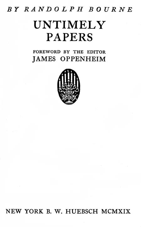 This book relates to the war and the present crisis of the world. It does a great service for our country. Without it our showing would be weak and impoverished compared with the Older Nations. We may rejoice that as England had her Bertrand Russell, France her Rolland and Barbusse, Germany her Liebknecht and Nicolai, so America had her Randolph Bourne.