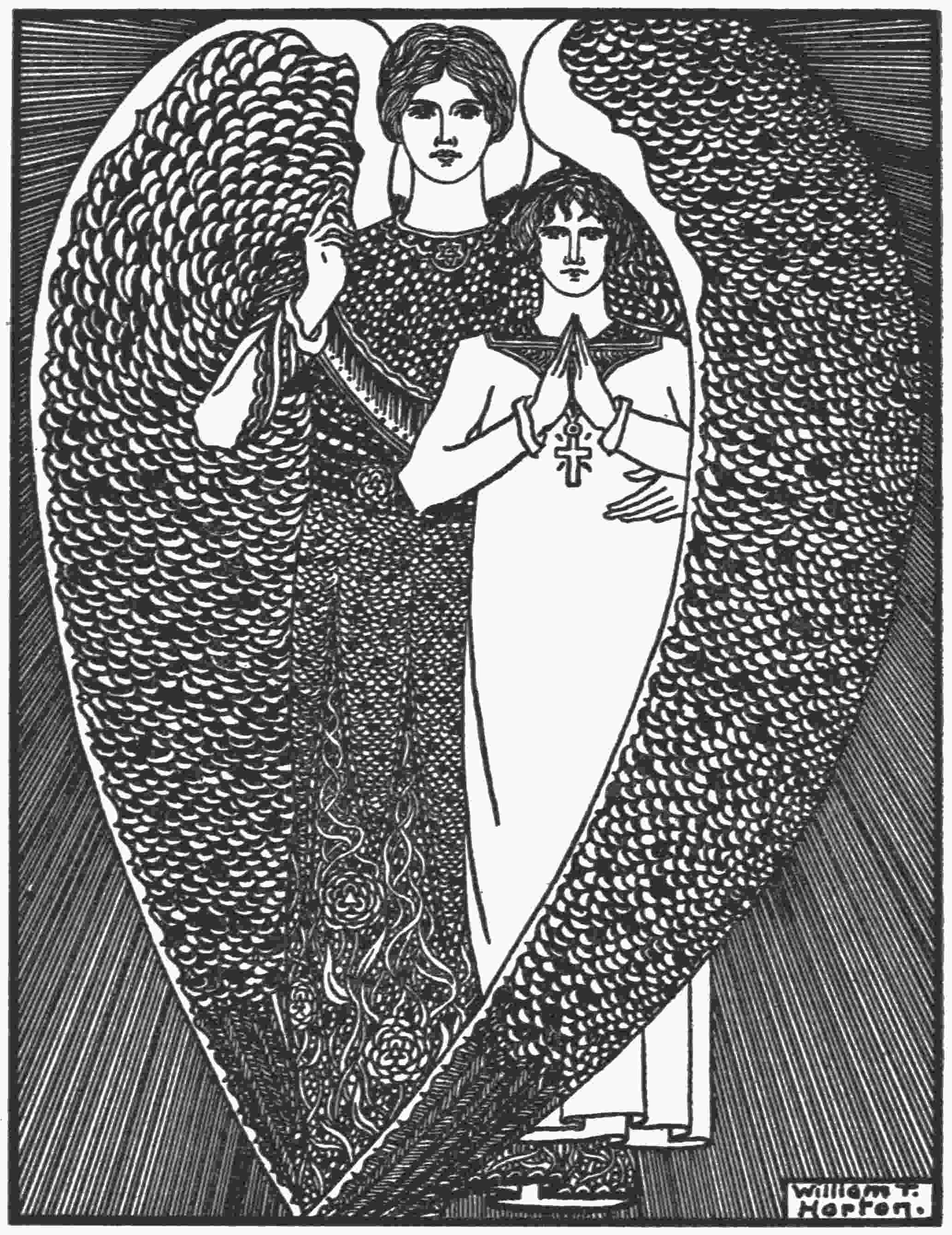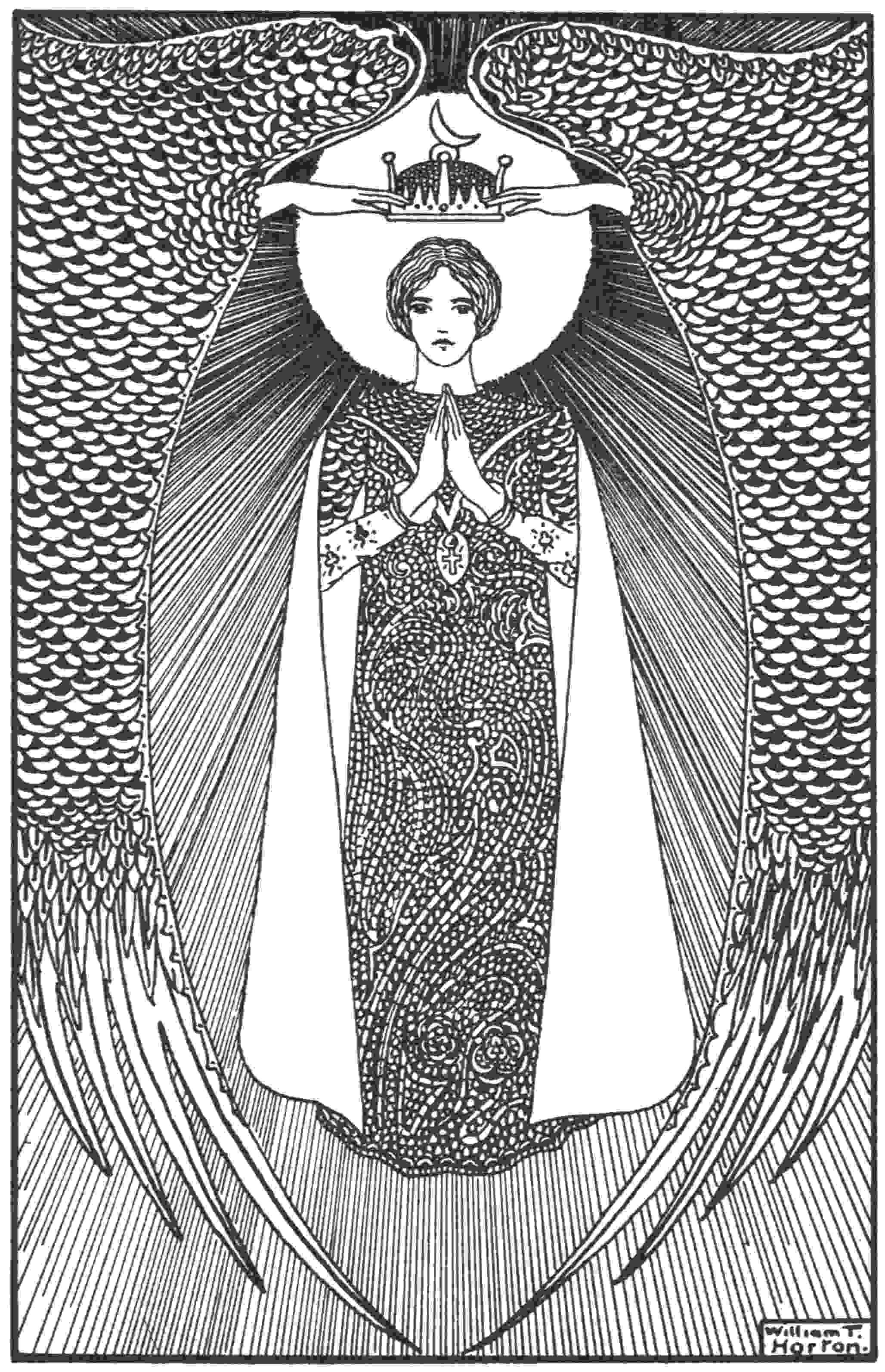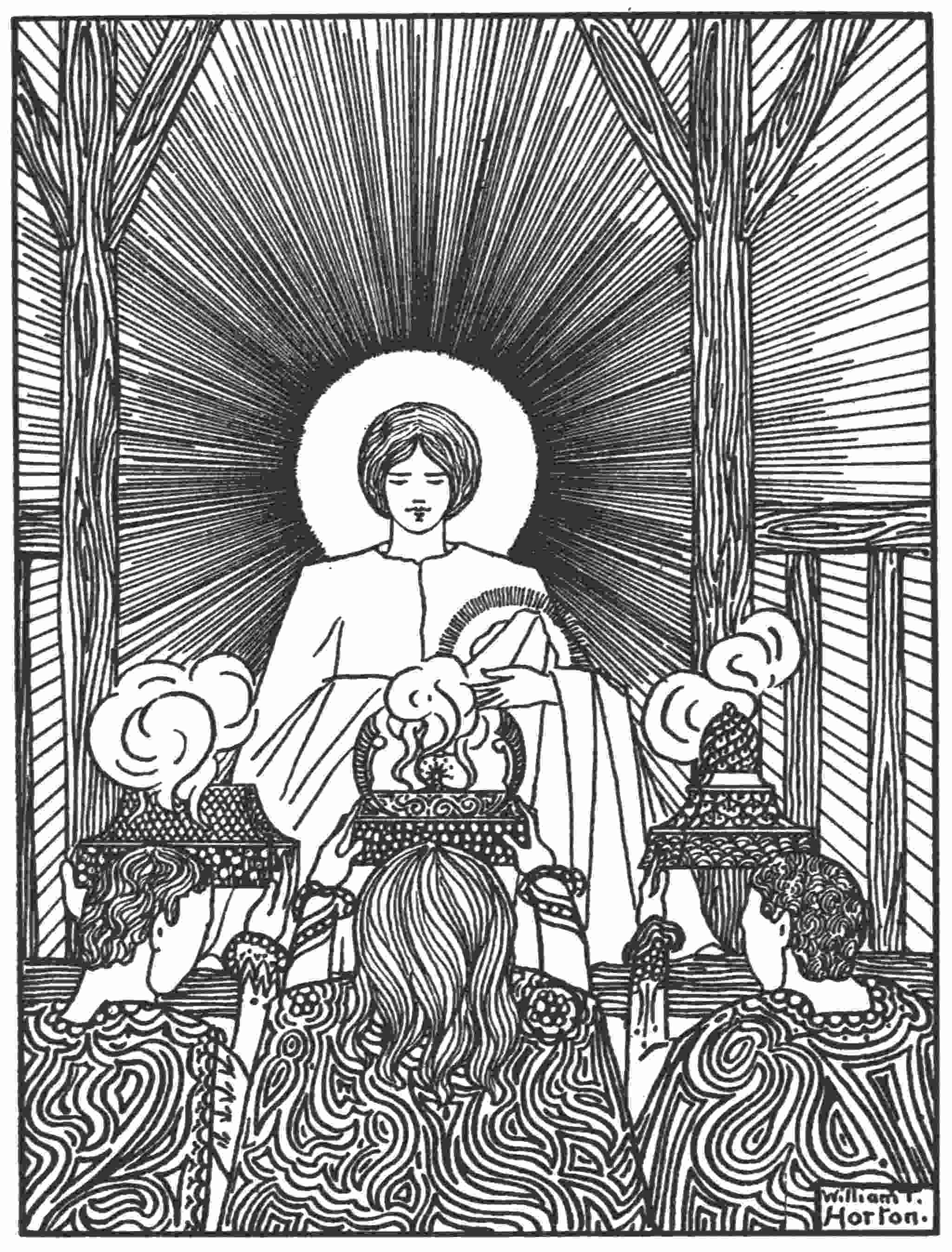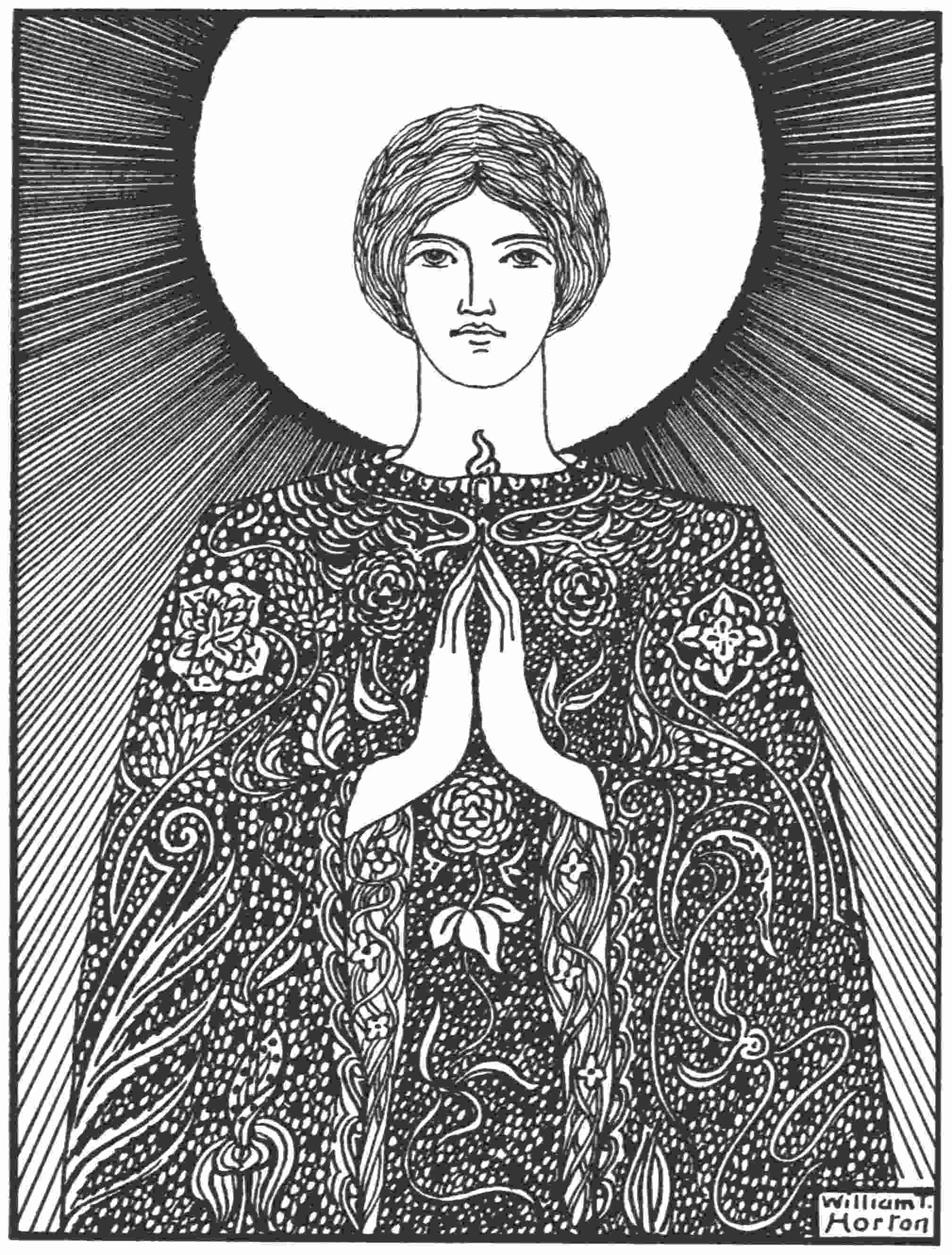 3. Mr. Horton, who is a disciple of “The Brotherhood of the New Life,” which finds the way to God in waking dreams, has his waking dreams, but more detailed and vivid than mine; and copies them in his drawings as if they were models posed for him by some unearthly master. A disciple of perhaps the most mediæval movement in modern mysticism, he has delighted in picturing the streets of mediæval German towns, and the castles of mediæval romances; and, at moments, as in All Thy waves are gone over me, the images of a kind of humorous piety like that of the mediæval miracle-plays and moralities. Always interesting when he pictures the principal symbols of his faith, the woman of Rosa Mystica and Ascending into Heaven, who is the Divine womanhood, the man-at-arms of St. George and Be Strong, who is the Divine manhood, he is at his best in picturing the Magi, who are the wisdom of the world, uplifting their thuribles before the Christ, who is the union of the Divine manhood and the Divine womanhood. The rays of the halo, the great beams of the manger, the rich ornament of the thuribles and of the cloaks, make up a pattern where the homeliness come of his pity mixes with an elaborateness come of his adoration. Even the phantastic landscapes, the entangled chimneys against15 a white sky, the dark valley with its little points of light, the cloudy and fragile towns and churches, are part of the history of a soul; for Mr. Horton tells me that he has made them spectral, to make himself feel all things but a waking dream; and whenever spiritual purpose mixes with artistic purpose, and not to its injury, it gives it a new sincerity, a new simplicity. He tried at first to copy his models in colour, and with little mastery over colour when even great mastery would not have helped him, and very literally: but soon found that you could only represent a world where nothing is still for a moment, and where colours have odours and odours musical notes, by formal and conventional images, midway between the scenery and persons of common life, and the geometrical emblems on mediæval talismans. His images are still few, though they are becoming more plentiful, and will probably be always but few; for he who is content to copy common life need never repeat an image, because his eyes show him always changing scenes, and none that cannot be copied; but there must always be a certain monotony in the work of the Symbolist, who can only make symbols out of the things that he loves. Rossetti and Botticelli have put the same face into a number of pictures; M. Maeterlinck has put a mysterious comer, and a lighthouse, and a well in a wood into several plays; and Mr. Horton has repeated again and again the woman of Rosa Mystica, and the man-at-arms of Be Strong; and has put the crooked way of The16 Path to the Moon, “the straight and narrow way” into St. George, and an old drawing in The Savoy; the abyss of The Gap, the abyss which is always under all things, into drawings that are not in this book; and the wave of The Wave, which is God’s overshadowing love, into All Thy waves are gone over me.