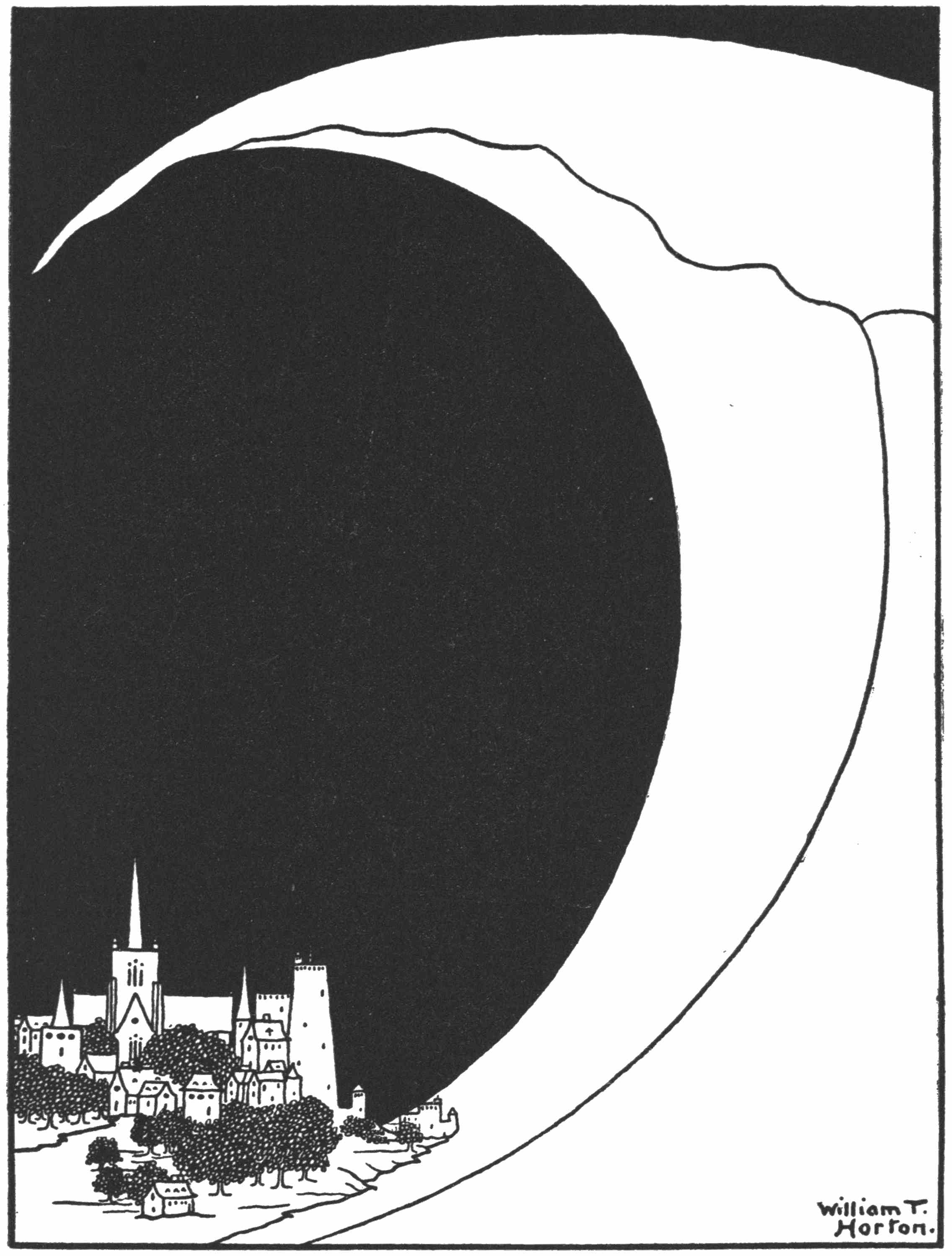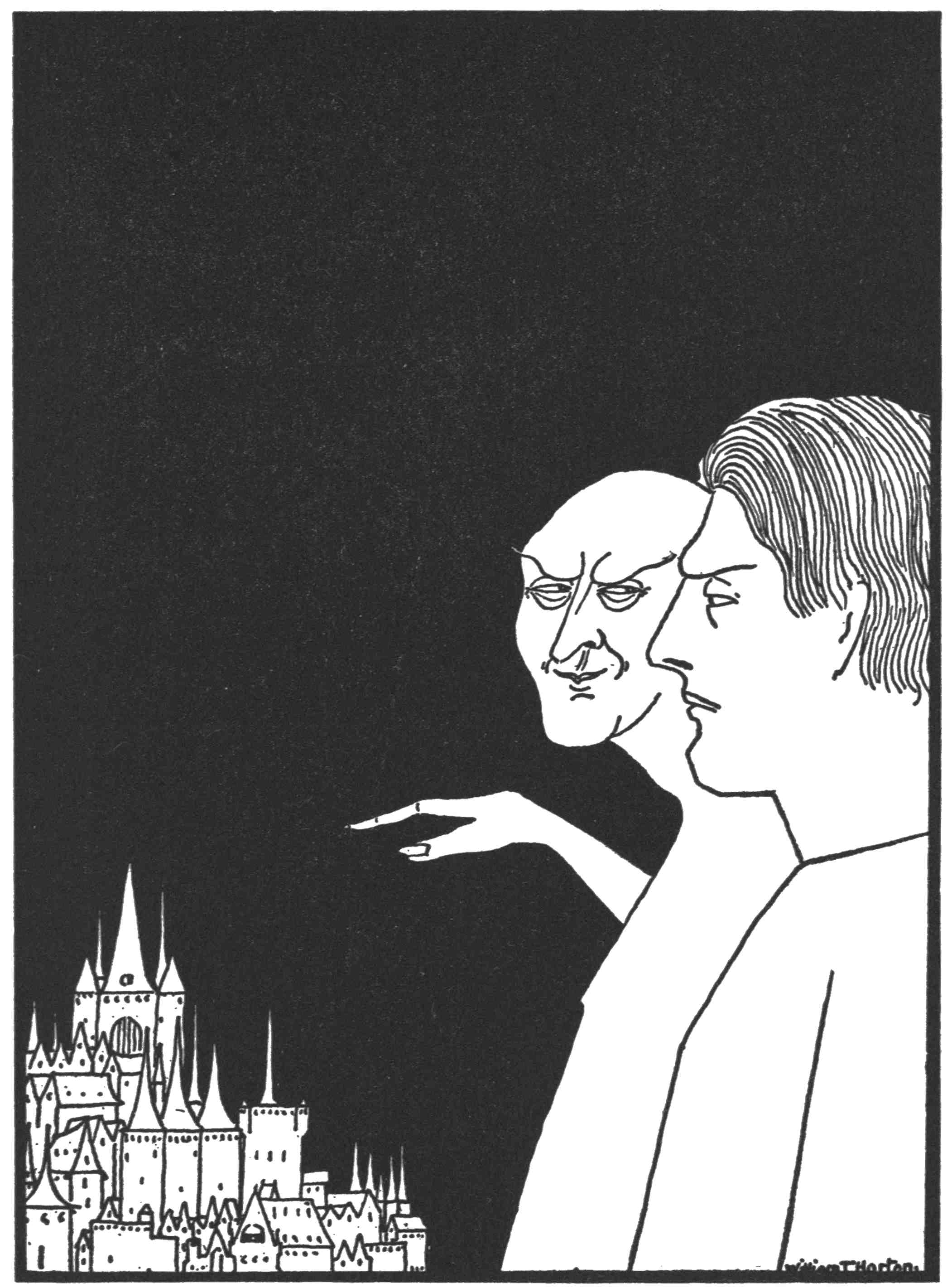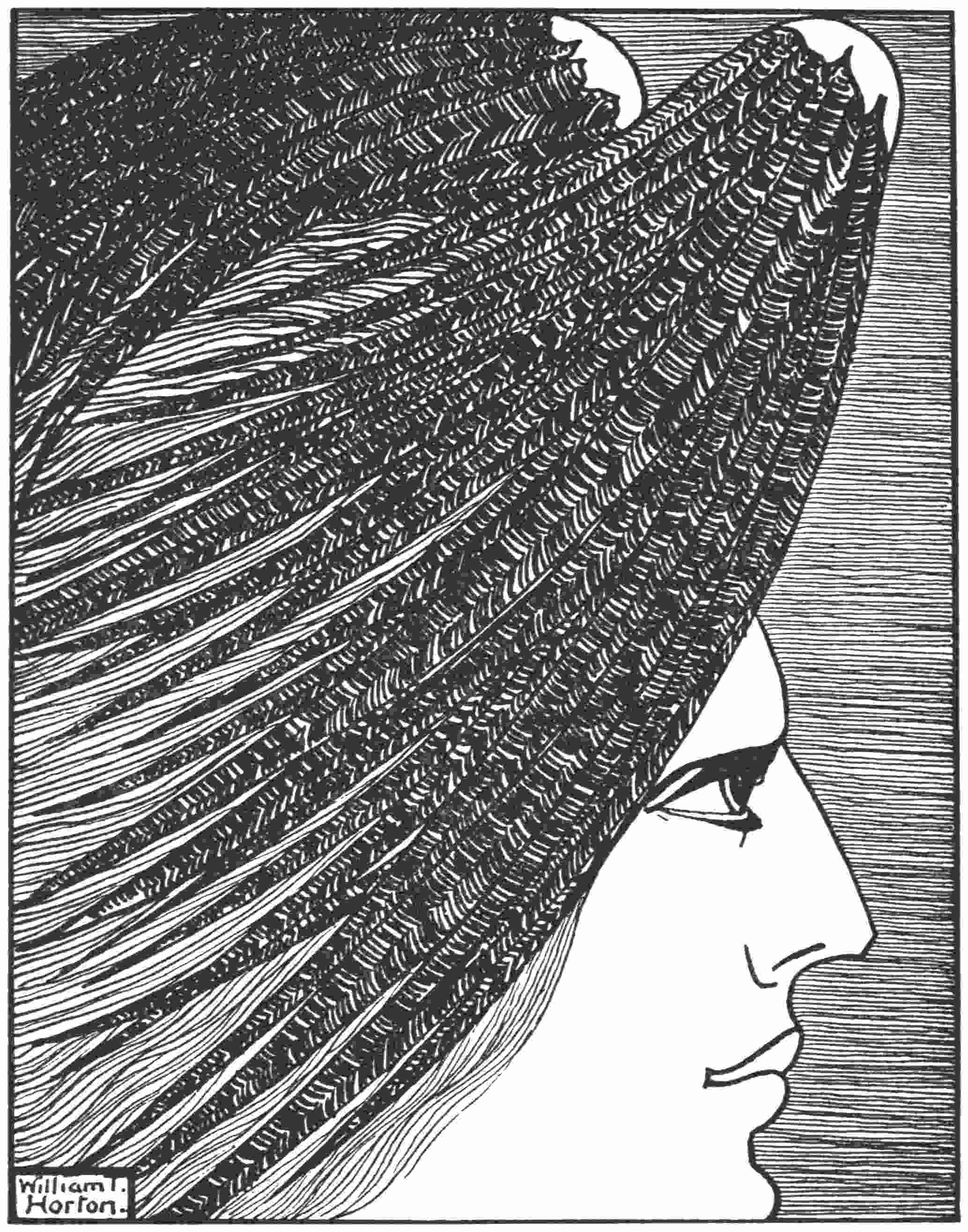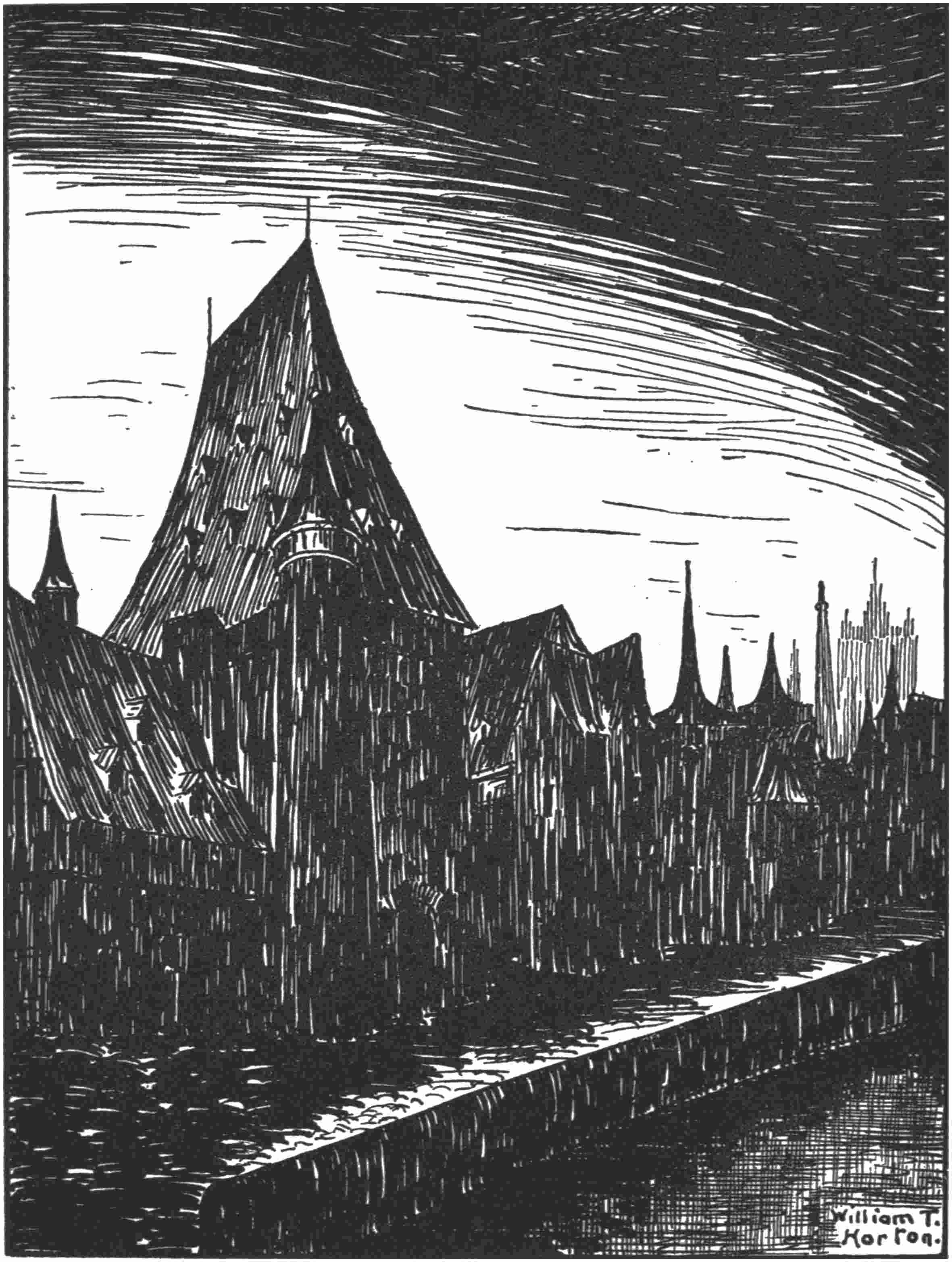 3. Mr. Horton, who is a disciple of “The Brotherhood of the New Life,” which finds the way to God in waking dreams, has his waking dreams, but more detailed and vivid than mine; and copies them in his drawings as if they were models posed for him by some unearthly master. A disciple of perhaps the most mediæval movement in modern mysticism, he has delighted in picturing the streets of mediæval German towns, and the castles of mediæval romances; and, at moments, as in All Thy waves are gone over me, the images of a kind of humorous piety like that of the mediæval miracle-plays and moralities. Always interesting when he pictures the principal symbols of his faith, the woman of Rosa Mystica and Ascending into Heaven, who is the Divine womanhood, the man-at-arms of St. George and Be Strong, who is the Divine manhood, he is at his best in picturing the Magi, who are the wisdom of the world, uplifting their thuribles before the Christ, who is the union of the Divine manhood and the Divine womanhood. The rays of the halo, the great beams of the manger, the rich ornament of the thuribles and of the cloaks, make up a pattern where the homeliness come of his pity mixes with an elaborateness come of his adoration. Even the phantastic landscapes, the entangled chimneys against15 a white sky, the dark valley with its little points of light, the cloudy and fragile towns and churches, are part of the history of a soul; for Mr. Horton tells me that he has made them spectral, to make himself feel all things but a waking dream; and whenever spiritual purpose mixes with artistic purpose, and not to its injury, it gives it a new sincerity, a new simplicity. He tried at first to copy his models in colour, and with little mastery over colour when even great mastery would not have helped him, and very literally: but soon found that you could only represent a world where nothing is still for a moment, and where colours have odours and odours musical notes, by formal and conventional images, midway between the scenery and persons of common life, and the geometrical emblems on mediæval talismans. His images are still few, though they are becoming more plentiful, and will probably be always but few; for he who is content to copy common life need never repeat an image, because his eyes show him always changing scenes, and none that cannot be copied; but there must always be a certain monotony in the work of the Symbolist, who can only make symbols out of the things that he loves. Rossetti and Botticelli have put the same face into a number of pictures; M. Maeterlinck has put a mysterious comer, and a lighthouse, and a well in a wood into several plays; and Mr. Horton has repeated again and again the woman of Rosa Mystica, and the man-at-arms of Be Strong; and has put the crooked way of The16 Path to the Moon, “the straight and narrow way” into St. George, and an old drawing in The Savoy; the abyss of The Gap, the abyss which is always under all things, into drawings that are not in this book; and the wave of The Wave, which is God’s overshadowing love, into All Thy waves are gone over me.