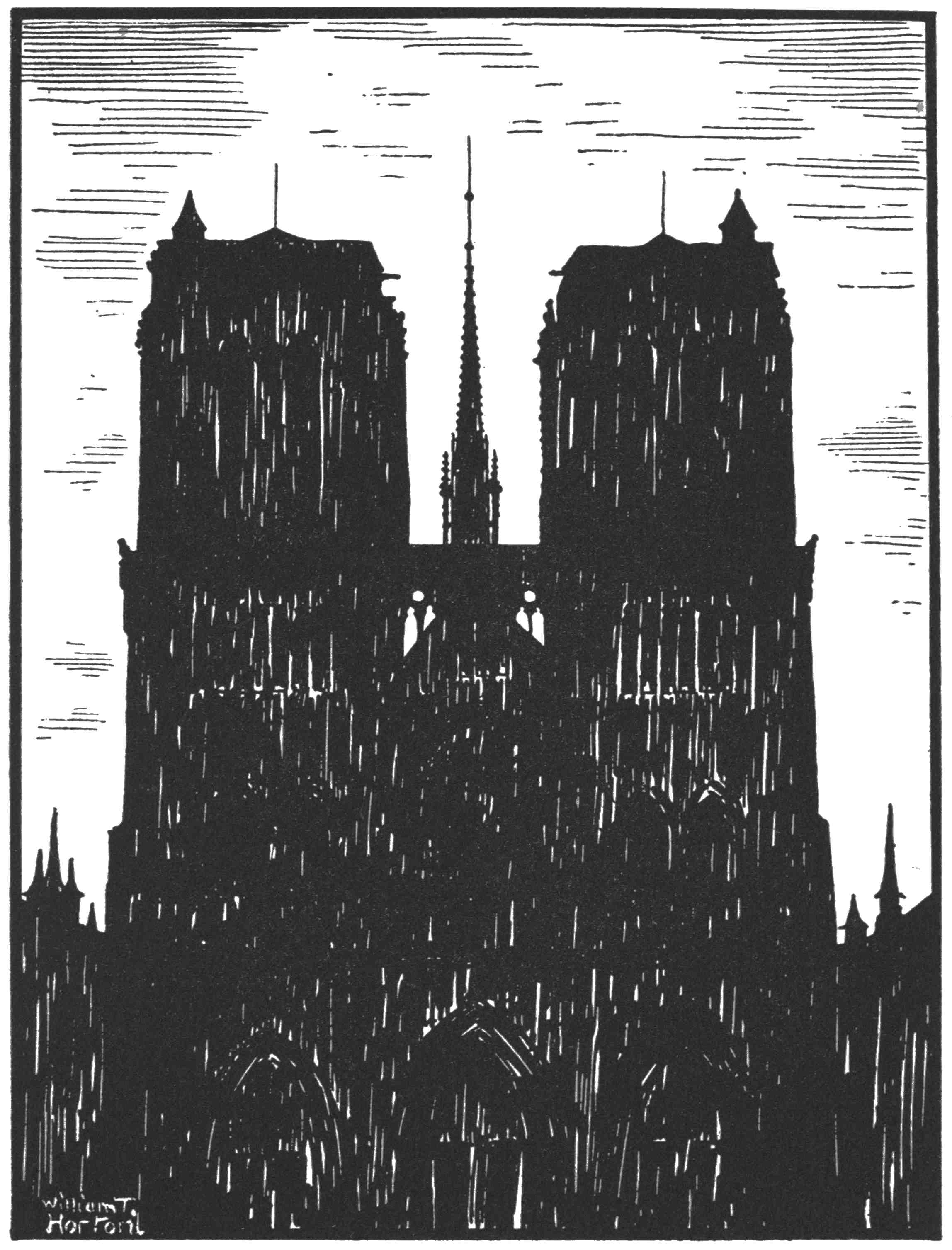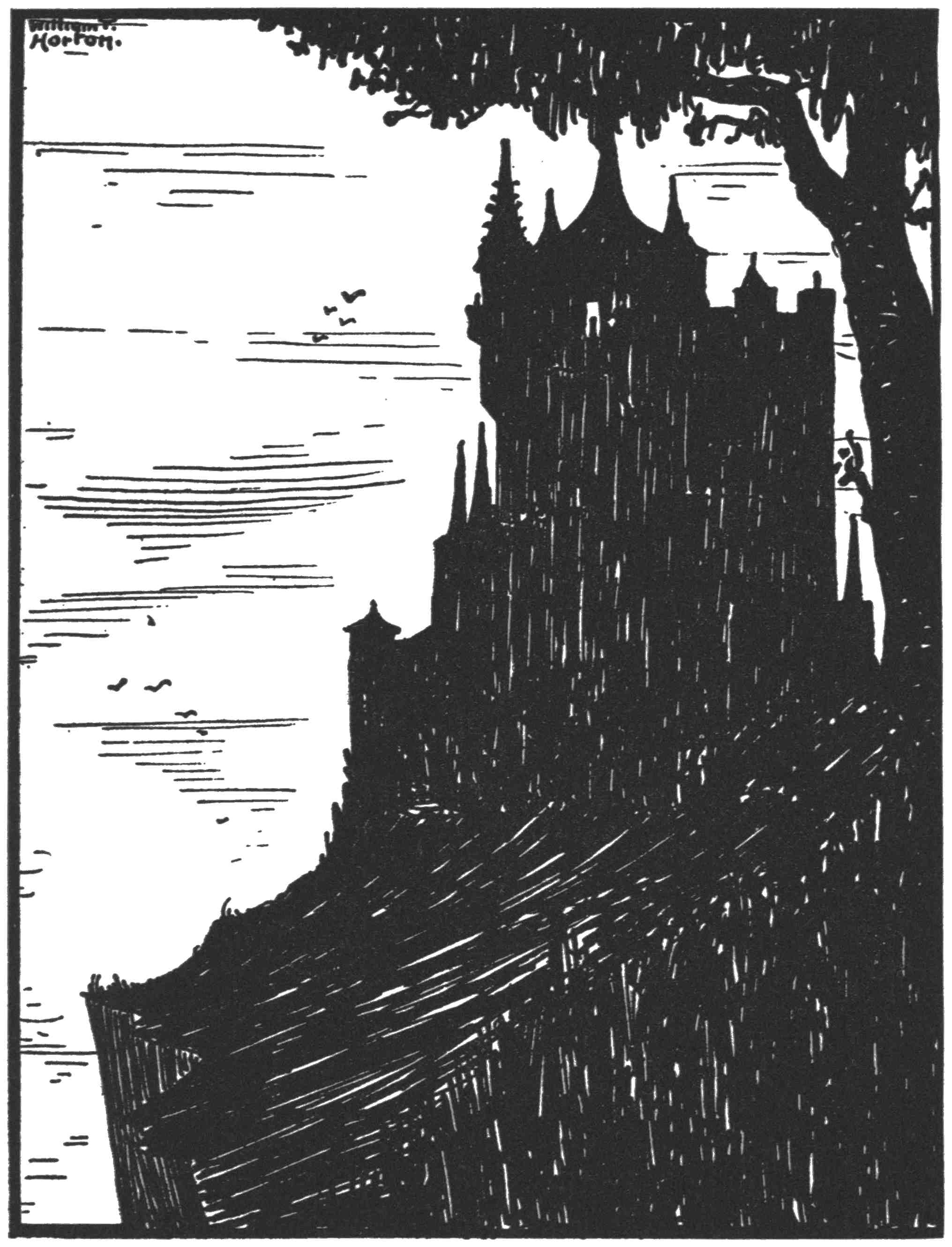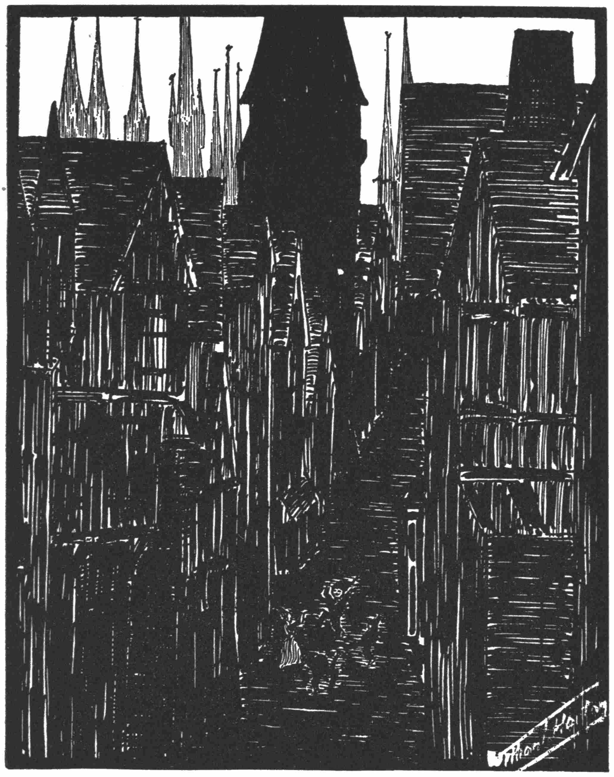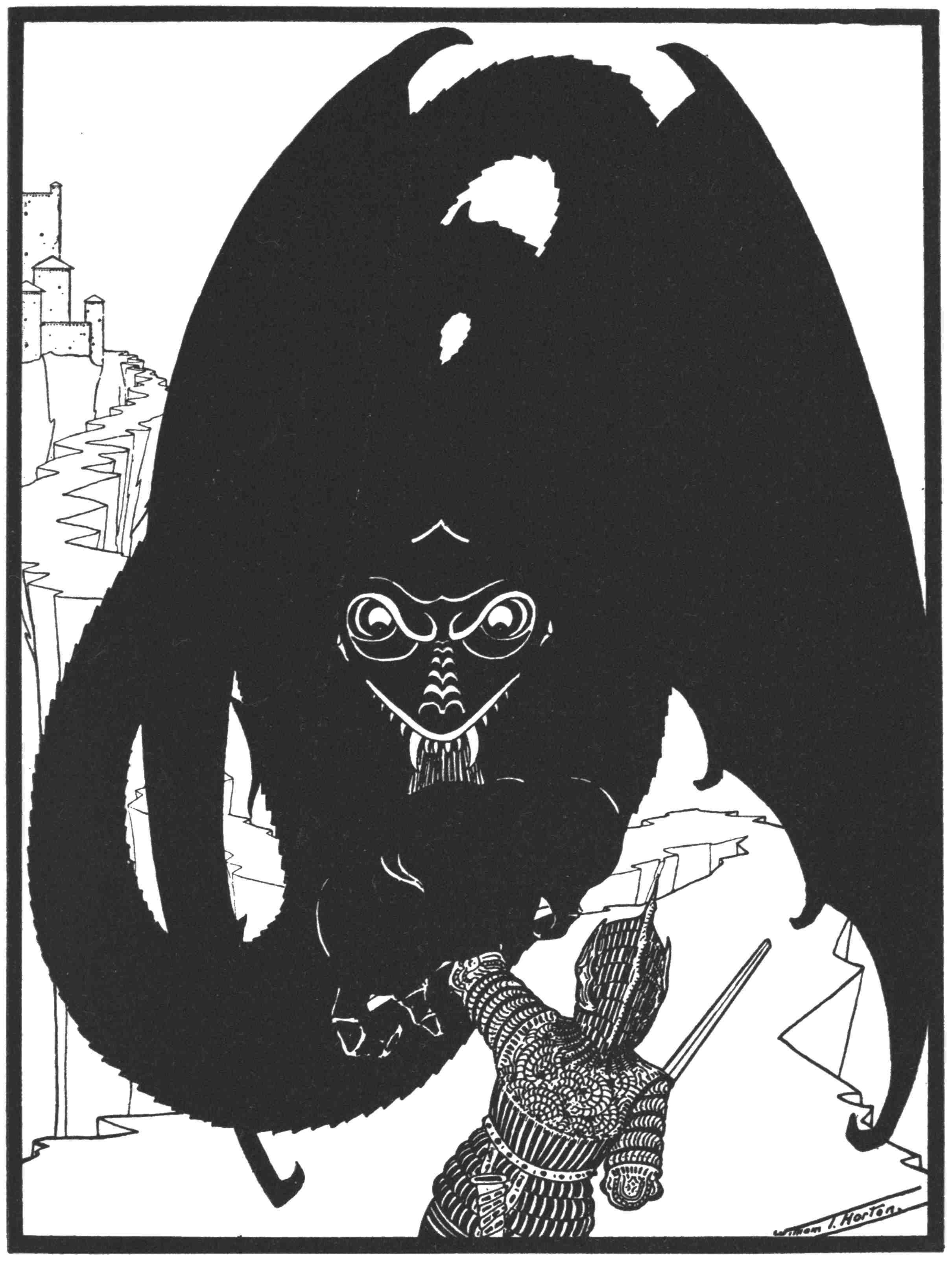 3. Mr. Horton, who is a disciple of “The Brotherhood of the New Life,” which finds the way to God in waking dreams, has his waking dreams, but more detailed and vivid than mine; and copies them in his drawings as if they were models posed for him by some unearthly master. A disciple of perhaps the most mediæval movement in modern mysticism, he has delighted in picturing the streets of mediæval German towns, and the castles of mediæval romances; and, at moments, as in All Thy waves are gone over me, the images of a kind of humorous piety like that of the mediæval miracle-plays and moralities. Always interesting when he pictures the principal symbols of his faith, the woman of Rosa Mystica and Ascending into Heaven, who is the Divine womanhood, the man-at-arms of St. George and Be Strong, who is the Divine manhood, he is at his best in picturing the Magi, who are the wisdom of the world, uplifting their thuribles before the Christ, who is the union of the Divine manhood and the Divine womanhood. The rays of the halo, the great beams of the manger, the rich ornament of the thuribles and of the cloaks, make up a pattern where the homeliness come of his pity mixes with an elaborateness come of his adoration. Even the phantastic landscapes, the entangled chimneys against15 a white sky, the dark valley with its little points of light, the cloudy and fragile towns and churches, are part of the history of a soul; for Mr. Horton tells me that he has made them spectral, to make himself feel all things but a waking dream; and whenever spiritual purpose mixes with artistic purpose, and not to its injury, it gives it a new sincerity, a new simplicity. He tried at first to copy his models in colour, and with little mastery over colour when even great mastery would not have helped him, and very literally: but soon found that you could only represent a world where nothing is still for a moment, and where colours have odours and odours musical notes, by formal and conventional images, midway between the scenery and persons of common life, and the geometrical emblems on mediæval talismans. His images are still few, though they are becoming more plentiful, and will probably be always but few; for he who is content to copy common life need never repeat an image, because his eyes show him always changing scenes, and none that cannot be copied; but there must always be a certain monotony in the work of the Symbolist, who can only make symbols out of the things that he loves. Rossetti and Botticelli have put the same face into a number of pictures; M. Maeterlinck has put a mysterious comer, and a lighthouse, and a well in a wood into several plays; and Mr. Horton has repeated again and again the woman of Rosa Mystica, and the man-at-arms of Be Strong; and has put the crooked way of The16 Path to the Moon, “the straight and narrow way” into St. George, and an old drawing in The Savoy; the abyss of The Gap, the abyss which is always under all things, into drawings that are not in this book; and the wave of The Wave, which is God’s overshadowing love, into All Thy waves are gone over me.