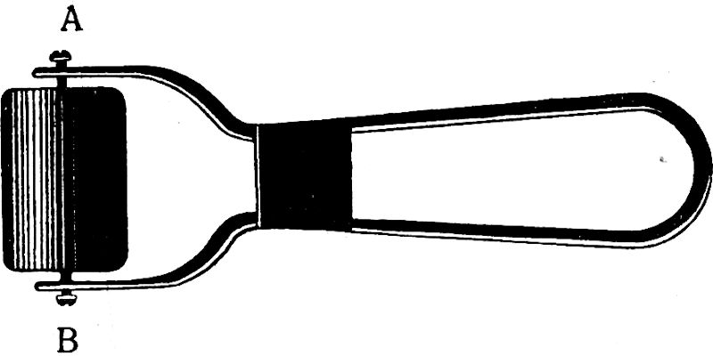 Die grundierte, kalte Platte wird auf den Tisch gelegt und mit einer gestielten feinen Stahldrahtbürste (siehe Abb. 16) sachte geschlagen, wobei die Kupferplatte mit der linken Hand fortwährend zu drehen ist, damit die Wirkung gleichmäßig erfolge. Die Verletzungen des Ätzgrundes haben nämlich die Form zarter kurzer Strichelchen von bestimmter Richtung. Das Drehen der Platte mit der linken Hand soll also das Vorherrschen einer gewissen Richtung der Strichelchen verhüten.