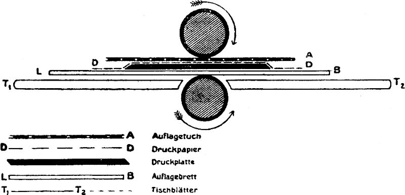 Allerdings sehr empfehlenswert ist die Anschaffung einer nicht gar zu kleinen Handwalzenpresse; namentlich dann, wenn man beabsichtigt, selbst auch eine kleine Auflage von Abzügen für den engeren Verkehr zu drucken. Man ist durchaus nicht an große Firmen gebunden, ein vertrauenswürdiger, intelligenter Maschinenschlosser wird eine solche Walzenpresse mit Bessemerwalzen samt Gestell und den zwei Tischblättern mit gewiß geringeren Kosten und ganz exakter Leistung herzustellen wissen; nur darf die Federung und die Verstellbarkeit der oberen Achsenlager nicht vergessen werden.