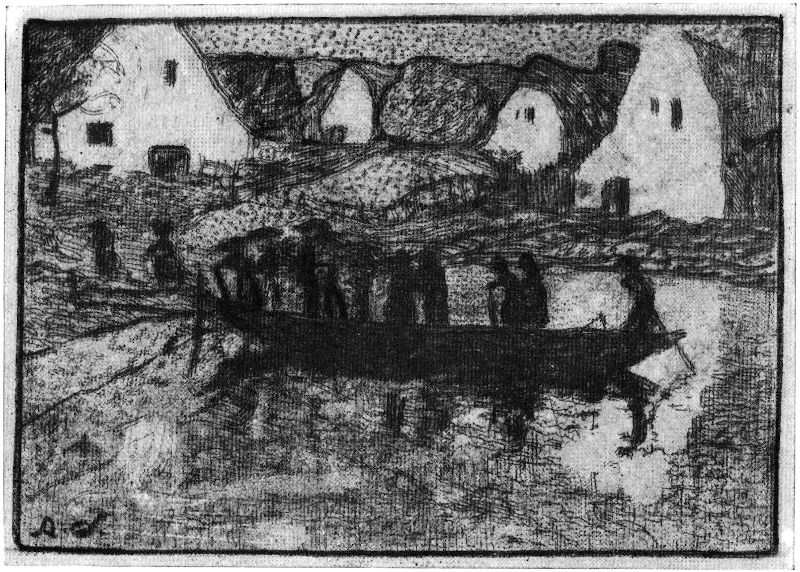 Nicht jedes Motiv, nicht jede Bildidee eignet sich gleich gut für eine Durchführung in Aquarell, in Holzschnitt, für eine Radierung oder für ein Ölgemälde. Für den Radierer ergibt sich daraus der Schluß, daß er nicht ohne Überlegung an sein Werk gehen darf. Linienschönheit, Tonschönheit, das sind die Mittel, mit denen die Radierung arbeitet. Sie wird zum erschöpfenden Ausdruck,[89] wenn sie im Motiv, in der Idee, Verwandtes findet und dieses mit ihren Mitteln also zu einer höheren Einheit erheben kann.