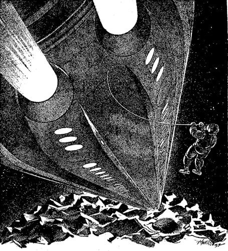 "It should not be necessary to point out to you that if they have been able to develop a wall shield that will stand up under detonating duodecaplylatomate, the back blast through the breech of the Q-gun will blow the Brittania apart as though she were made of matchwood. That is only one of the chances—and perhaps not the greatest one—that you and your crew will have to take. They are all volunteers, by the way, and will get plenty of extra rating if they come through alive. Do you want the job?"