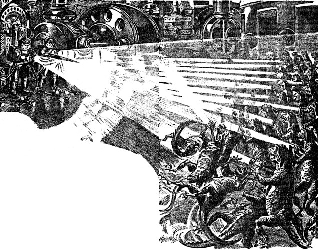 Down stairway after stairway he dived, down to the compartment in which was housed the great air purifier. Now let them come! Even if they had a spy ray on him, now it would be too late to do them a bit of good. And now, by all the gods of space, that fleet had better be out there, getting ready to blast!