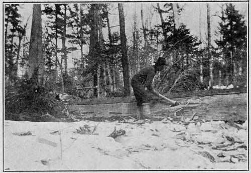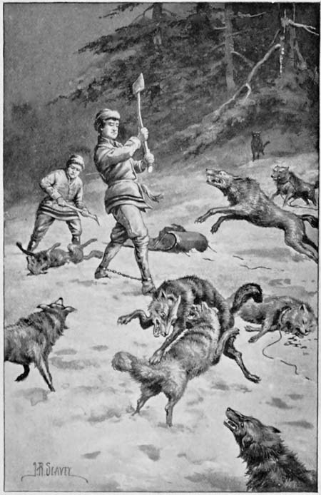 Learning that there was a shortage of teamsters. Kid, who knew a little about horses, offered himself for this work, and accordingly was assigned to team supplies for the camp along the tote road from the railroad, about sixty miles away. In sending him out Scott cautioned him of the danger from the wolves, particularly at night, and told him that if he[144] were caught out on the road after nightfall he was to stop and build a fire at the first howl. Failing time for this he was to unhitch his team, climb on their backs, and make the camp the best way he could. He was instructed, however, to provide against being out after night by leaving the Halfway house, thirty miles from camp, at daybreak.