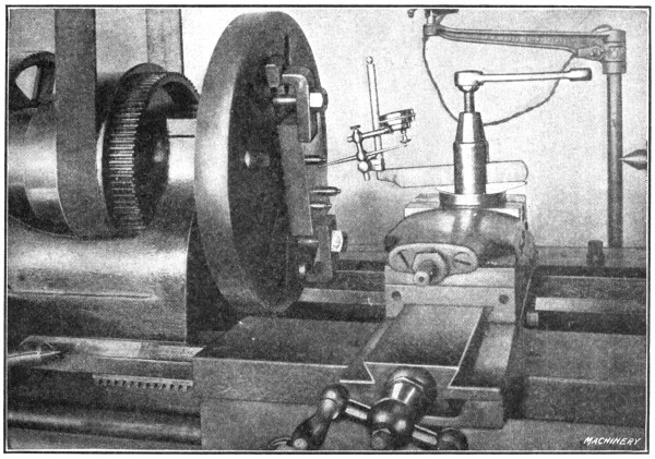 After the buttons have been set and the screws are tightened, all measurements should be carefully checked. The work is then mounted on the faceplate of the lathe and one of the buttons is set true by the use of a test indicator as shown in Fig. 4. When the dial of the indicator ceases to vibrate, thus showing that the button runs true, the latter should be removed so that the hole can be drilled and bored to the required size. In a similar manner other buttons are indicated and the holes bored, one at a time. It is evident that if each button is correctly located and set perfectly true in the lathe, the various holes will be located the required distance apart within very close limits.