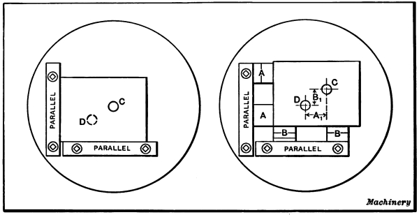 It is frequently necessary to bore holes in cast jig-plates or machine parts, which either have irregularly shaped or unfinished edges. A good method of locating such work is illustrated in Fig. 30. The part to be bored is attached to an auxiliary plate A which should have parallel sides and at least two edges which are straight and at right angles to each other. This auxiliary plate with the work, is clamped against an accurate angle-plate B, which should be set square with the axis of the machine spindle. A parallel strip is bolted to the angle-plate and the inner edge is set square with the machine table. After the first hole is bored, the work is located for boring the other [Pg 38] to the edge of the auxiliary plate, and horizontal measurements y between the parallel and the plate. These measurements, if quite large, might be taken with micrometer gages, whereas, for comparatively small adjustments, size blocks might be more convenient.