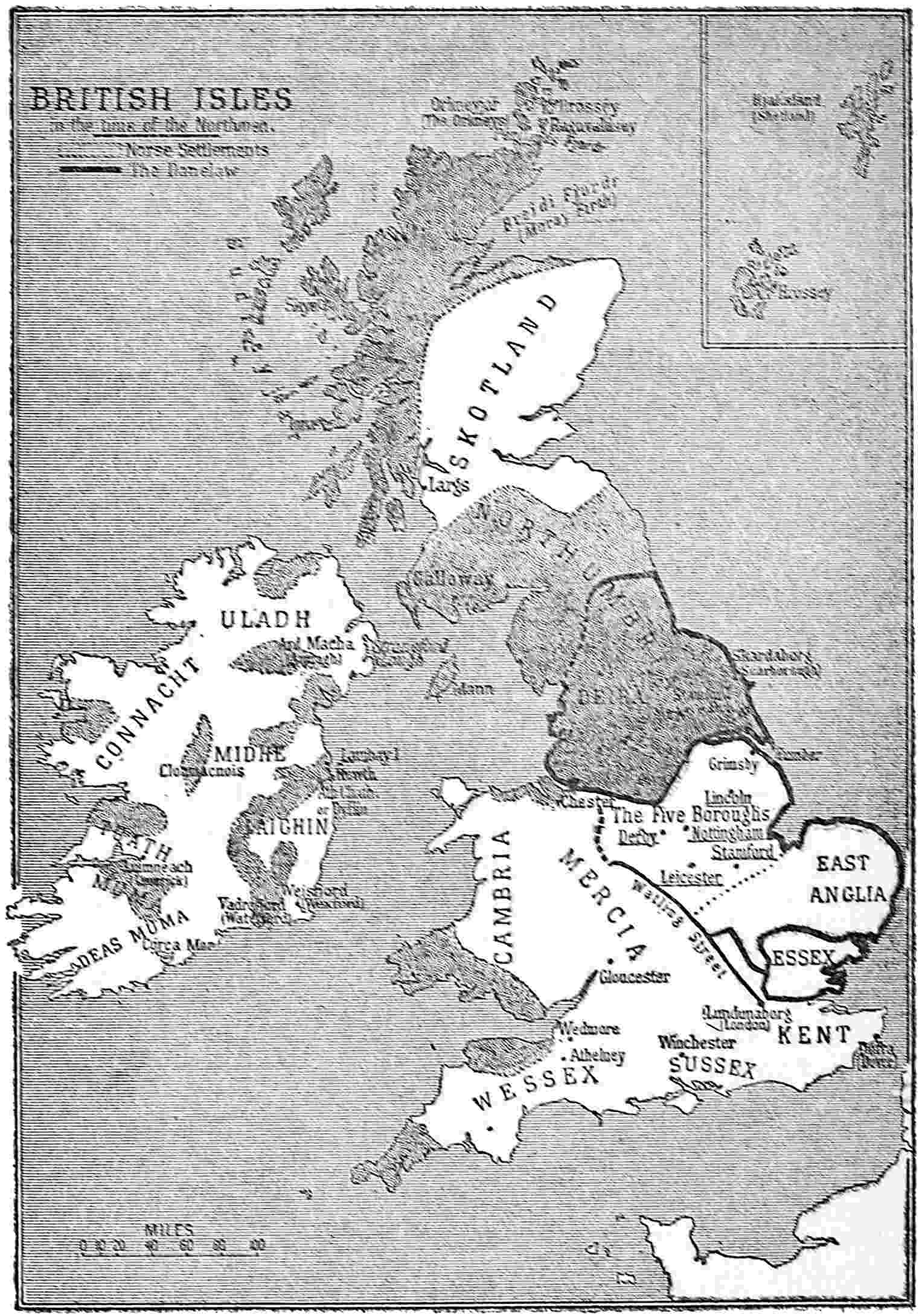 Two great streams of Northern immigration met on the shores of Britain during the ninth, tenth, and eleventh centuries. The Norsemen from the deep fiords of Western Norway, fishing and raiding along the coasts, pushed out their adventurous boats into the Atlantic, and in the dawn of Northern history we find them already settled in the Orkney and Shetland Isles, whence they raided and settled southward to Caithness, Fife, and Northumbria on the east, and to the Hebrides, Galloway, and Man on the western coast. Fresh impetus was given to this outward movement by the changes of policy introduced by Harald Fairhair, first king of Norway (872–933). Through him a nobler type of emigrant succeeded the casual wanderer, and great lords and kings’ sons came over to consolidate the settlements begun by humbler agencies. Iceland was at the same time peopled by a similar stock. The Dane, contemporaneously with the Norseman, came by a different route. Though he seems to have been the first to invade Northumbria (if Ragnar and his sons were really Danes), his movement was chiefly round the southern shores of England, passing over by way of the Danish and Netherland coast up the English Channel, and round to the west. Both streams met in Ireland, where a sharp and lengthened contest was fought out between the two nations, and where both6 took deep root, building cities and absorbing much of the commerce of the country.