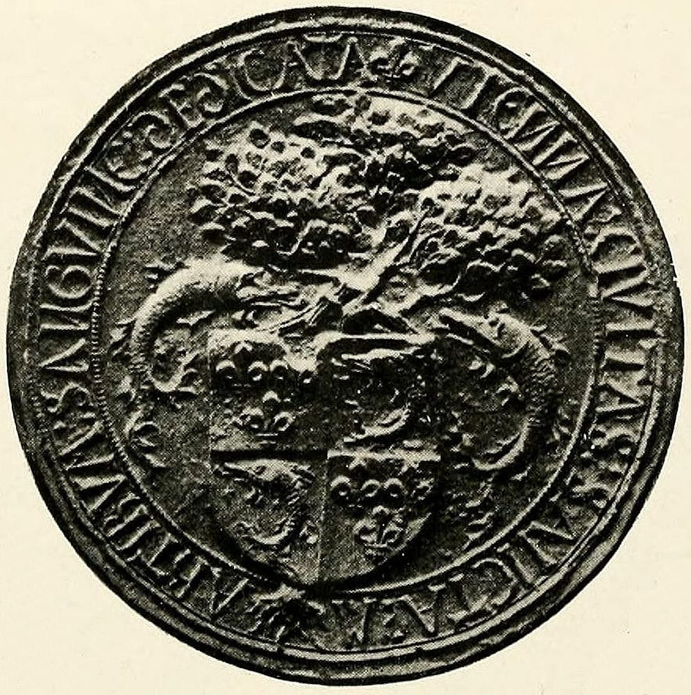 Manche or Maunche.—A severely conventionalized form of a sleeve, derived from the actual sleeve which was worn at a tournament, as a ladies’ favour, floating from the shoulder of a favoured knight. The illustrations are from the fifteenth century seal of Lord Hastings (Fig. 273), and from a MS. of the following century relating to the same family (Fig. 274).