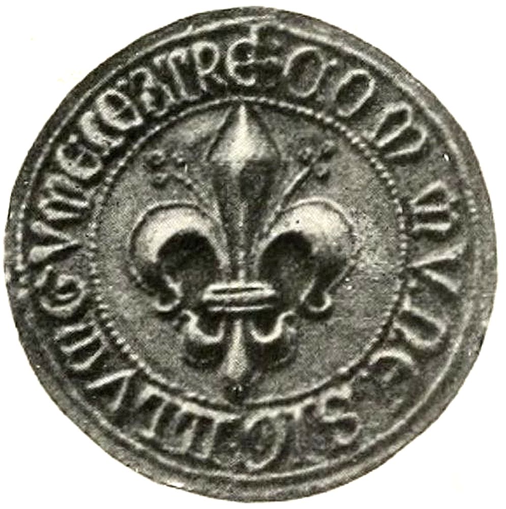 In order to distinguish the various members of a family among themselves certain additions to the shield called marks of cadency are employed; and in the earliest days of the heraldic system a son charged the arms that he derived from his father with such a mark of difference as he thought fit and effectual, but by the middle of the fourteenth century some amount of regularity was arrived at, and by the end of the sixteenth century the present method had become usual. In this system the eldest son is distinguished by a file or label of three points, which consists of a horizontal part from which depend the lambeaux (Fig. 286 et seq.). Its origin is extremely obscure, and whether it represents the points of garments, or tongues or labels threaded on a cord, no one can say with certainty. It seems probable that it may have originally been a favour or distinction whose history and original significance have[Pg 287] been lost. The effigy at Artois of Charles Count d’Eu has a label which passes round the shoulders, exactly as other collars did, and consists of large labels charged with castles and suspended from what appears to be a narrow cord (Fig. 288).