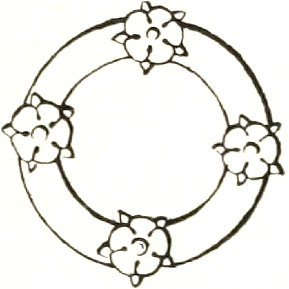 Chaplet.—A wreath of leaves or of flowers and leaves. In the latter the flowers are usually four in number (Fig. 242). When a “chaplet” without further qualification is mentioned, a severely conventionalized form is sometimes employed, consisting of[Pg 270] a ring with four flower bosses, as Fig. 243. See Garland. A chaplet of oak is called a civic crown (Fig. 244), and one of laurel a triumphal crown.