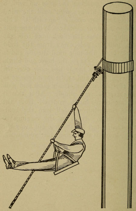 Stand along the side of the stack, throwing your head to one side and looking up, allowing your eyes to follow the stack and the clouds, shaking the head at different times. This brings on dizziness. Then stand erect, so as to clear your head. After getting into the boatswain chair, you place the fall line of your riggings—that is, the line with which you draw yourself up—between your legs. This enables you and your helper to pull more steadily together, and you get to the top much quicker.