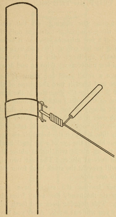 If the gimblet wire in question has been in that position for a year, in all probability it is rotten at the point where it runs through the hook at the top of the stack, and it would not take much weight to loosen it. So bear in mind, no matter how light or heavy in weight you may be, do not climb up on the gimblet wire.