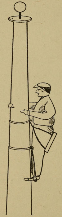 At any time you are working on a flagpole and the work consists of replacing a truck, ball or spindle, the only thing to do is to make sure of the pole being solid enough for a little swaying. If so, take a sling, lash yourself to the pole under the arms as a back brace, then reach up and pull yourself up and stand in the chair. Avoid shaking the pole as much as you possibly can. Then draw up the saw.
