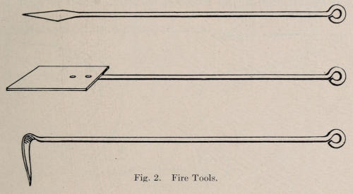 Figure 1 shows an illustration of a down draft forge suitable for schools; it is made of cast iron. A pressure fan furnishes the blast for the fire and an exhaust fan takes away the gas and smoke thru an opening at the bottom of the hood, and thru a large pipe which continues under the floor and out thru a flue. The hood represented at A, can be moved backward and forward to catch the smoke. The hood is moved with a crank and worm gear as shown at B. The hearth is shown at C; a hole in the center is called the tuyere. This is where the fire is built and is the outlet for the wind. The amount of air needed for the fire is regulated by a valve that is moved with a rod shown at D. The coal box is always at the right hand of any forge and is shown at E. The water box is represented at F. At G is shown the pressure pipe and at H the exhaust pipe. Notice the large opening under the forge at I. Thru this opening any nut or screw under the tuyere can be tightened with ease. Notice the slide-rod at J. This rod, when pulled, dumps the cinders out of the tuyere, and a bucket may be set under the hearth to catch them.[10] In school shops these forges are generally set in pairs in order to save room. Figure 2 shows three fire-tools needed for the forge fire. These tools consist of a poker made from ⅜-inch round stock, 26 inches long with a loose eye turned on one end for a handle; a shovel with a flat blade 4 by 6 by ¹⁄₁₆ inches with a handle riveted to the blade, and a tool called a scraper. This scraper is made from the same stock as the poker and is made with an eye at one end and a flat hook at the other. It is used to scrape the coal and coke onto the fire, and to move pieces of coke or coal, so that the iron may be seen while heating.