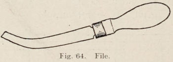 In case the channel is not as straight as it should be, a small flat file is heated and bent at the end and rehardened. (See Figure 64.) This file is used to straighten up the edges of the channel. A small cold chisel can also be used for this purpose. The channel must be straight along the top edge. When the channel is well straightened, strips of copper are filed to fit the channel, letting them project above the channel about[129] ³⁄₃₂ of an inch and also having each piece a little short in length. When the pieces are all in place, the handle is set on the anvil and with a heavy hammer they are driven down forcing the copper to fill the whole of the channel. The entire handle is filed to the dimensions given in Figure 63.