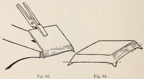 In making a very simple lamp of this character, we may eliminate the strips running up the pipe, and make the bottom with a round pipe screwed into it. Of course a square standard would be more in keeping[141] with the square base and shade. In making the box-shaped base, soft steel should be used. Figure 81 shows the dimensions of the flat stock. The plate is heated and an inch of the edge is bent over the outer edge of the anvil, as shown in Figure 82. The outer edges of the plate can be bent over the end of the anvil as shown in Figure 83. When all the edges are bent the piece will look somewhat as in Figure 84. The corners are now ground off, and the bottom is made level. A hole is drilled in the center and threaded for a ¾-in. steam pipe. Two inches from the center hole, another hole is drilled and tapped for a ¼-in. or ⅜-in. rubber bushing. In wiring the lamp, the cord should enter thru the bushing from the outside, and under and up thru the pipe to the socket. The drawing for the pipe is shown at Figure 85, also a bushing which is brazed into the top of the pipe and threaded for a ⅛-in. pipe. The ⅛-in. steam pipe and bushing are shown in position in the illustration at one end of the pipe. This small pipe[142] is for the lamp socket to be screwed onto. The other end of the large pipe is to be threaded and screwed into the base. The pipe should be screwed into the base far enough, so that the threads will not be exposed to the outside and the surplus cut off. The pipe when screwed tight should be brazed to the base. In doing this, the borax and spelter should be applied to the under side, after the base is well heated, as the brass will discolor the iron on the top side. When the pipe is brazed it should be made to stand vertical.