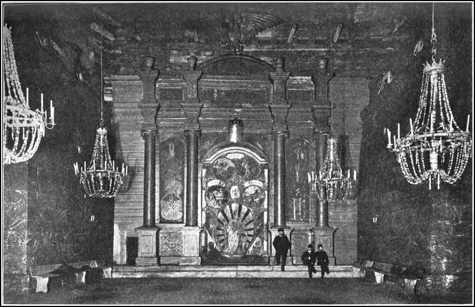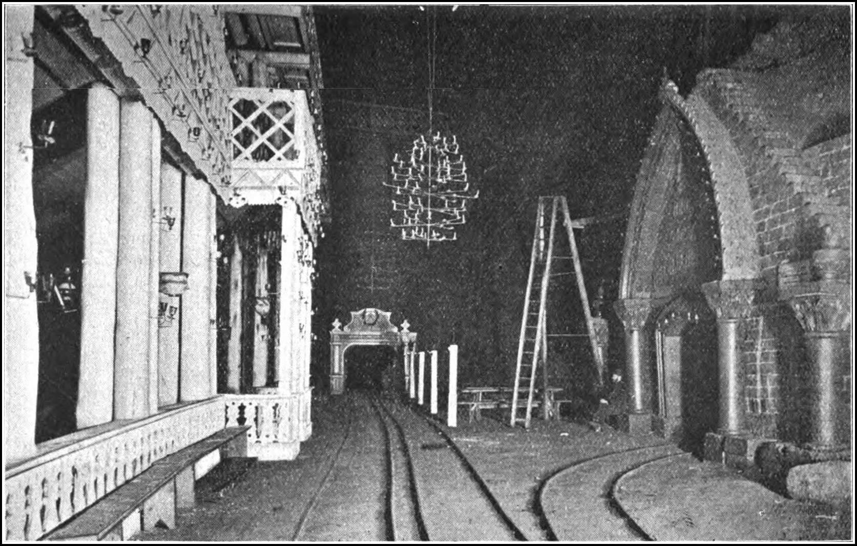As soon as the miners had sunk the shaft to the depth of the sole or floor of the mine and had made an opening large enough for their purpose, they proceeded to blast off enough rock to form a chamber about 5 ft. high. This formed, they advanced by blasting off the rock-salt from the face of the seam. The salt was loaded into waggons, which ran along small railways to the mouth of the shaft. The men engaged in blasting the rock and squaring the walls and pillars (for these were left quite square and well hewn) were called miners ; those who loaded the trucks and conveyed them to the shaft were ferriers. They were a fine set of men, and their occupation, compared with coal-mining, was a very healthy one. The mines were of an equable temperature, and were sufficiently warm for the men to dispense with their shirts. Being lofty, the air was pure, except when excessive blasting was undertaken. The greatest number of men employed in one pair of shafts was about eighty, and the quantity of blasting powder used by that number in the course of a day averaged 1 cwt. Safety fuses were seldom used, the charge being fired by a straw filled with fine powder, which was lighted from a candle.
