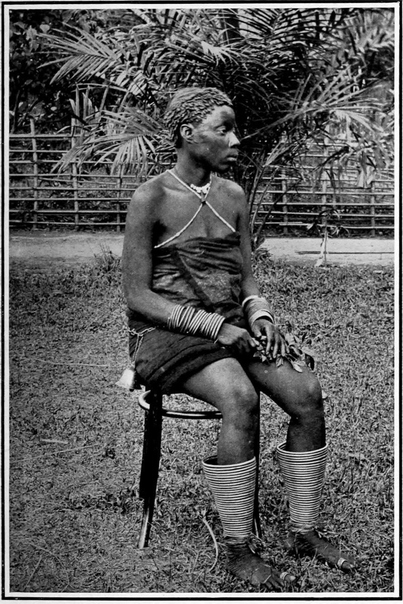 On arriving at the hut we saw, by the flickering blaze of the fire, a fine, well-proportioned woman of splendid physique. Her hair was arranged in a coiffure, coloured, stiffened, and kept in shape by being plastered with palm-oil, and the powder of burnt pea-nuts, or soot. It looked as though she wore a shining black fez on her head, slightly tilted backwards. She was probably a Bambala, or a Kiteke woman of that branch of the tribe that lived behind the riverine folk three hundred miles above Stanley Pool.