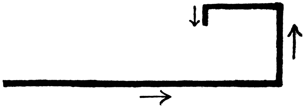 Sailors fear a shelterless coast much more than they fear storms and waves of the open sea. Although Ganawa was afraid to sail over the open lake for thirty-five miles, Bruce persuaded him that with the wind in their favor, it would be much safer to sail directly for Quebec Harbor on the south side of the island rather than creep along the harborless north shore, then approach the island on the wind and wave-swept north side and then paddle or sail around to the harbor on the south side. On such a trip, Bruce convinced Ganawa, they would surely have to travel against the wind or even in [246]the trough of the waves part of the time. “Look, Father,” Bruce closed his argument, drawing a figure in the sand, “we should have to go something like this: