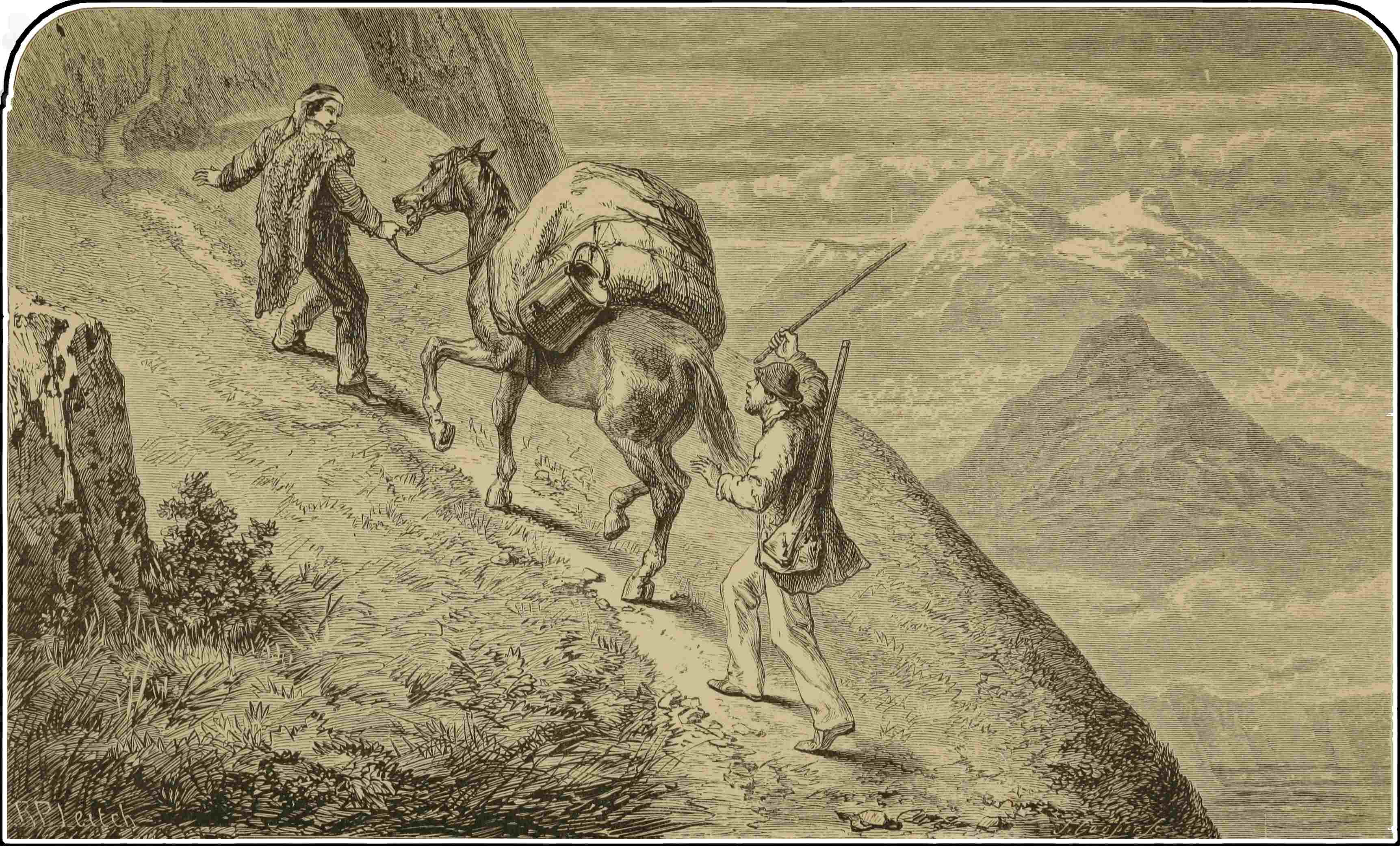 At Quesnelle Mouth we slung our roll of blankets on our backs, and started on foot for William’s Creek. The road was very rough, a narrow pack-trail cut through the woods; the stumps of the felled trees were left in the ground, and the thick stratum of mud in the spaces between was ploughed into deep holes by the continual trampling of mules. The ground had been frozen, and covered with several inches of snow, but this had partially melted, and rendered the surface greasy and slippery. We stumbled about amongst the hardened mud-holes, and our huge jack-boots soon blistered our feet so dreadfully, that by the second day we were almost disabled. Fortunately we picked up a pair of362 “gumboots”—long boots of India-rubber, used by the miners for working in the water—which had been cast away by the road-side, and substituting these for our cumbrous riding-boots, struggled on less painfully afterwards. The trail, gradually ascending, passed along the sides of pine-clad hills closely packed together, and separated only by the narrowest ravines; we had indeed entered the same region of mountain and forest which we had formerly encountered on the upper part of the North Thompson. By the road-side lay the dead bodies of horses and mules, some standing as they had died, still stuck fast in the deep, tenacious mud. We passed a score of them in one day in full view; and hundreds, which had turned aside to die, lay hidden in the forest which shut in the trail so closely. Martens and wood-partridges were numerous, and a tall Yankee, from the State of Maine, who had joined our company, greatly distinguished himself, knocking them over with his revolver from the tops of the high pines in a manner which astonished us. As we approached William’s Creek, the ascent became more rapid and the snow deeper, for the frost at this height had been unbroken.