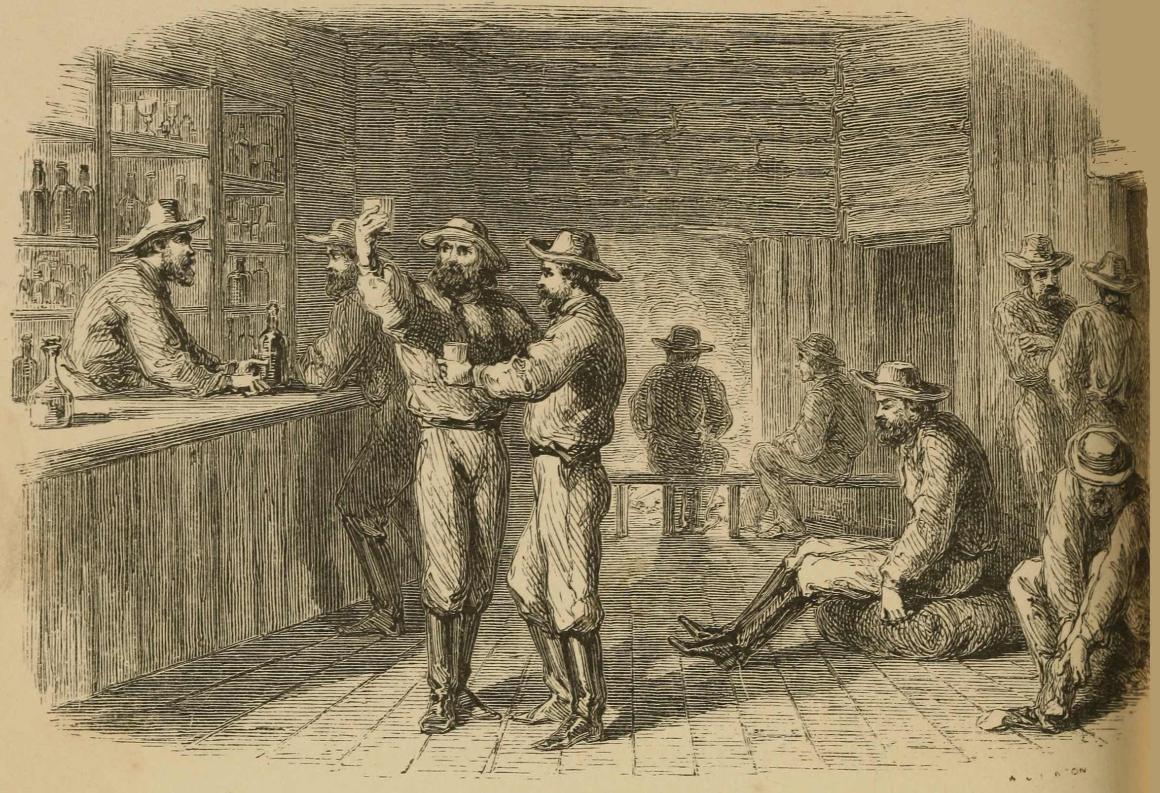After leaving Clinton, where the road from Yale comes in, the road began to ascend, and on the right we passed an extraordinary chasm. Commencing by a gradual depression at the northern end, it became a deep fissure in the rocks about a quarter of a mile in length, ending abruptly in the valley to the south. The depth of the gulf is some 400 or 500 feet, and its width about the same. The sides of the chasm were perpendicular and smooth, as if the rocks had been split asunder. The road still went up, and after a few miles we reached table-land,359 with a barren sandy soil, thickly covered with small spruce, and intersected by numerous lakes. The accommodation along the road was everywhere miserable enough, but after leaving Clinton it became abominable. The only bed was the floor of the “wayside houses,” which occur every ten miles or so, and are named the “Fiftieth” or “Hundredth Mile House,” according to the number of the nearest mile-post. Our solitary blankets formed poor padding against the inequalities of the rough-hewn boards, and equally ineffectual to keep out the cold draughts which whistled under the ill-fitting door of the hut. A wayside house on the road to the mines is merely a rough log hut of a single room; at one end a large open chimney, and at the side a bar counter, behind which are shelves with rows of bottles containing the vilest of alcoholic drinks. The miners on their journey up or down, according to the season—men of every nationality—Englishmen, Irishmen, and Scotchmen, Frenchmen, Italians, and Germans, Yankees and niggers, Mexicans and South Sea Islanders—come dropping in towards evening in twos and threes, divest themselves of the roll of blankets slung upon their backs, and depositing them upon the floor, use them as a seat, for the hut possesses few or none. The next thing is to have a “drink,” which is proposed by some one of the party less “hard up” than his friends, and the rest of the company present are generally invited to join in.