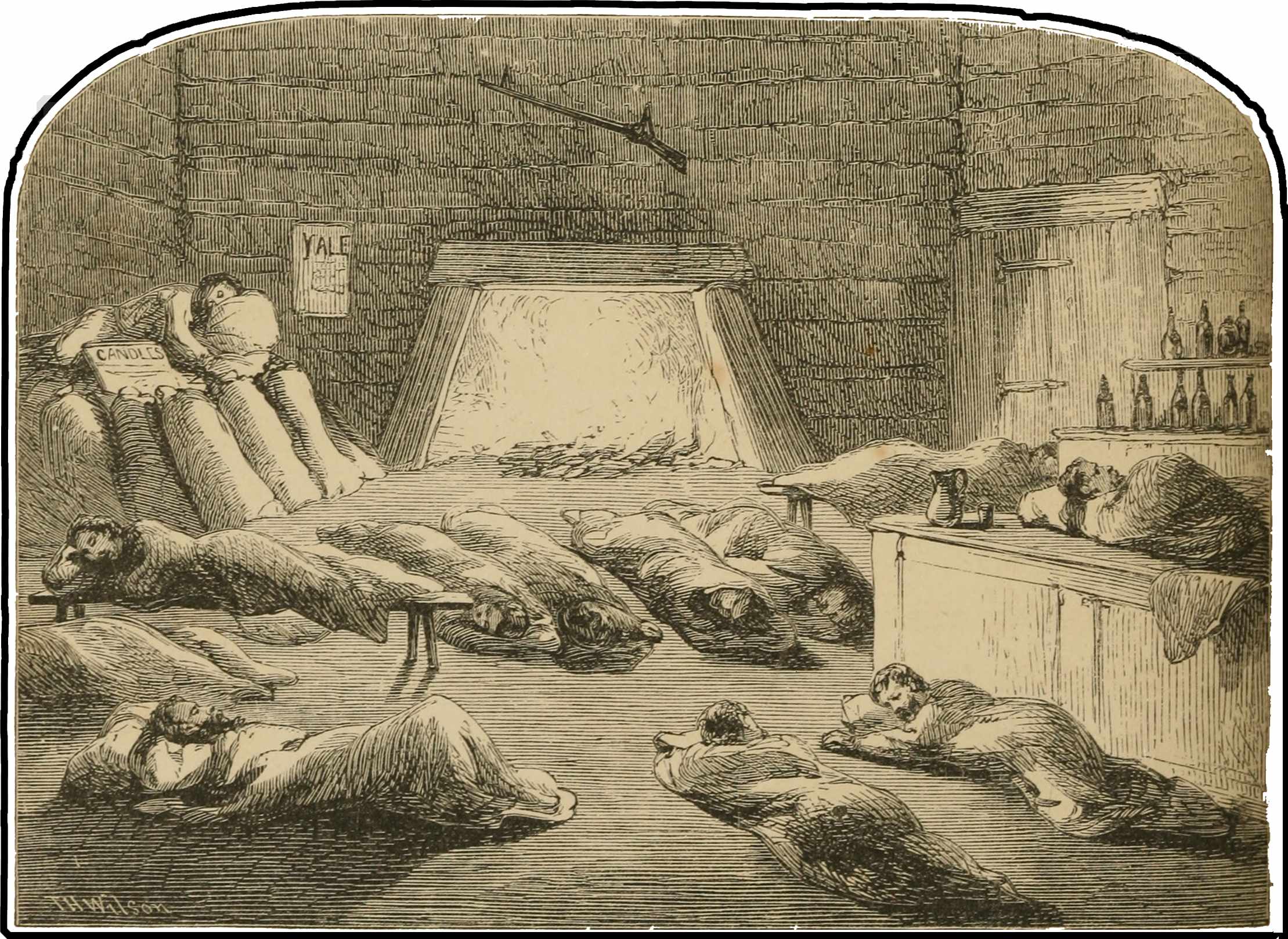 After supper and pipes, and more “drinks,” each360 unrolls his blankets, and chooses his bed for the night. Some elect to sleep on the counter, and some on the flour sacks piled at one end of the room, whilst the rest stretch themselves on the floor, with their feet to the fire. Occasionally a few commence gambling, which, with an accompaniment of drinking and blasphemy, goes on for the greater part of the night.