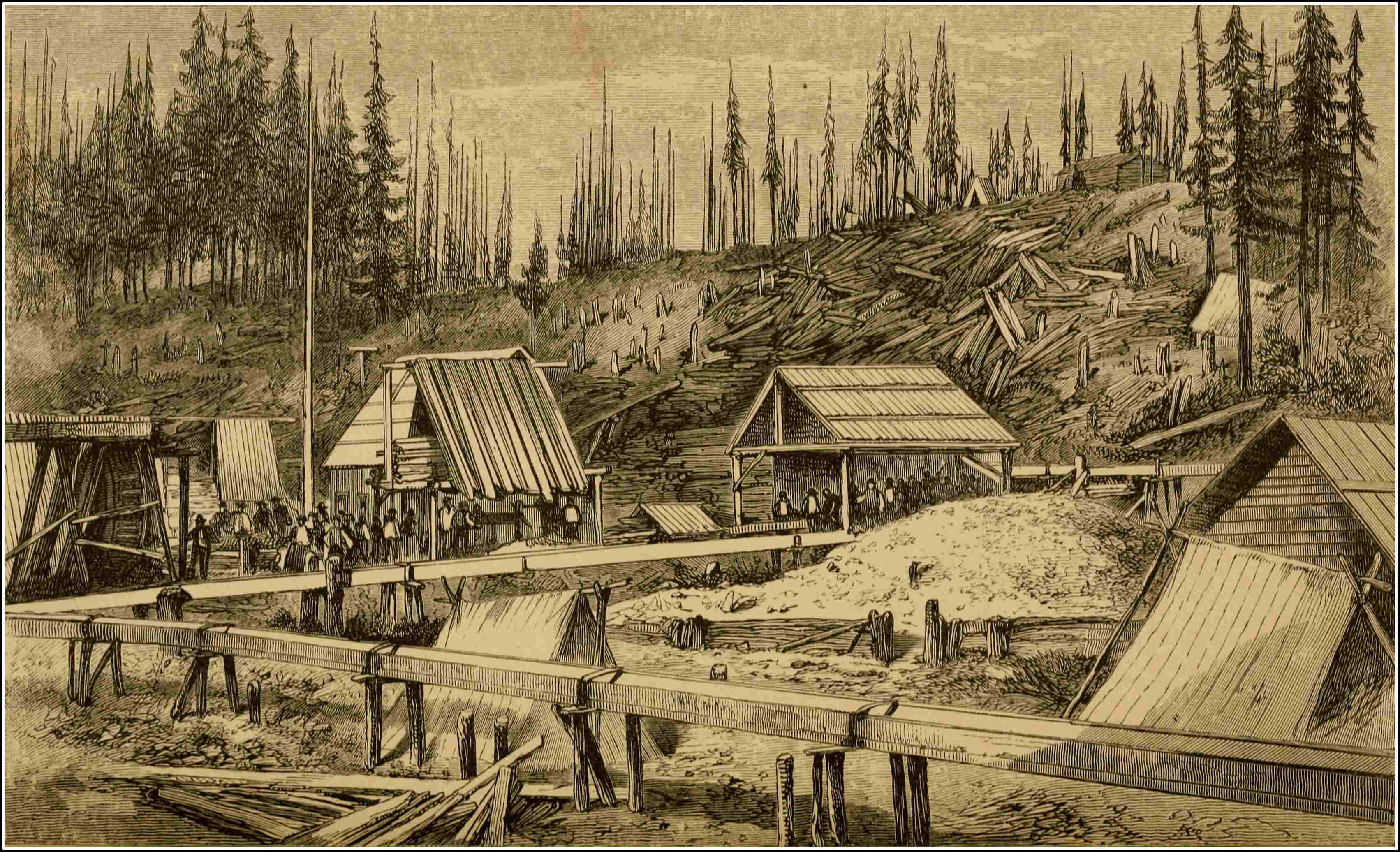 On the evening of the third day’s march we reached Richfield, sixty-five miles from the Mouth of Quesnelle; but, acting on the advice of our friend from Maine, walked on through Barkerville to Cameron Town, lower down the same creek, where the richest mines were being at this time worked. It was already dark, and we had a rough363 walk of it—along the bottom of the narrow ravine through which runs William’s Creek, scrambling over “flumes,” logs, and heaps of rubbish for about two miles, before we doffed our packs at Cusheon’s Hotel. We had reached Cariboo at last, although by a much more roundabout way than we originally intended.