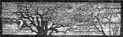 From our foolish garden-dreaming let us rest, and turn with a long look of revering love to the great Oak, that stands in his strength out in the park field, beyond the garden. On three sides round are lines of guardian Elms, in all their pride of delicate leafless intricacy; alone, amid the leafless ones, rises the Oak, wearing still his crown of brown, sere leaves. Smooth and straight grows up the giant stem, full twenty feet to the spring of the lowest branch. Two brother Oaks stand on either side. Their form is more rounded, more perfect; but high above them the great Oak uprears his head—unconcerned, and grandly branched, though shattered by every fierce west wind that blows. Every storm works some loss, but from the way each torn limb lies, you would say he had thrown it down in proud defiance. The wood-pigeons shelter among the summer leaves; the autumn ripens a rich store of acorns; and now, as I survey him from the terrace walk, or gaze upwards from the wet dead leaves beneath, through all the mystery[Pg 49] of his bare and spreading boughs, I think of Keats’ stanza—