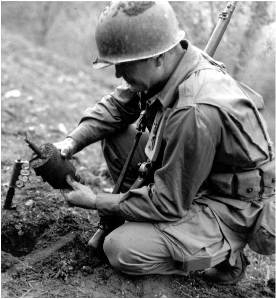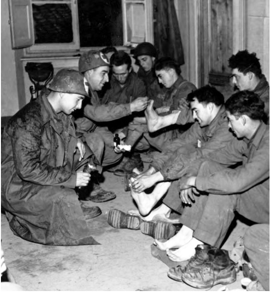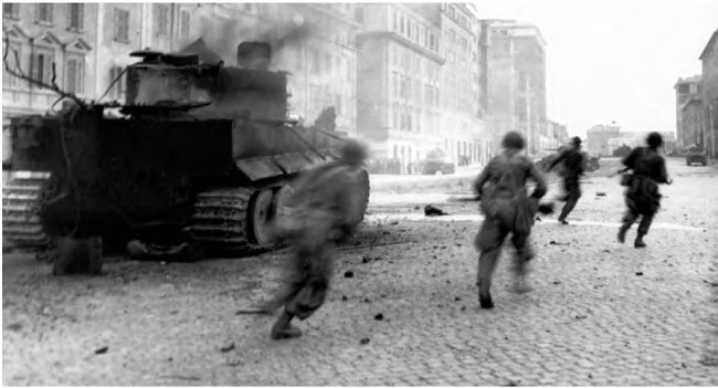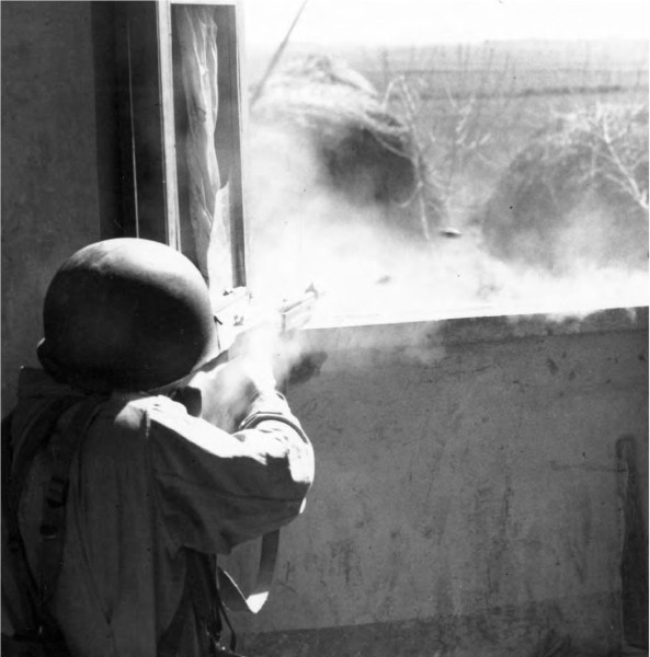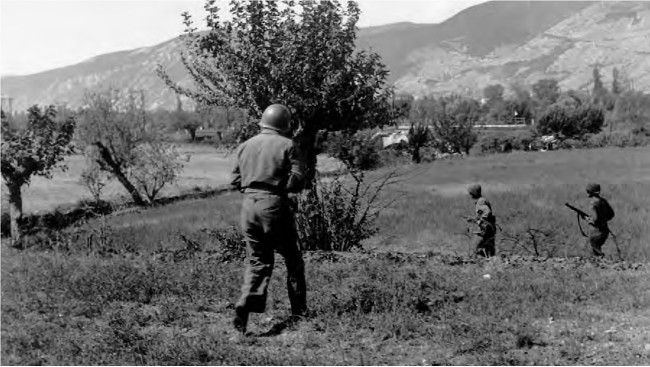 INFANTRY ACTION AT VICENZA, in the foothills of the Alps. The advance of the Allies across the plain was too fast for the Germans to halt, reorganize, and make a determined stand behind either the Po or the other rivers in the Po plain. Speedy thrusts by infantry-armor columns split the enemy forces and severed communications. After the crossing of the Po, the action on both sides developed into a race to the Alps, the enemy hoping to escape into Germany, the Allies determined to prevent them. Many isolated pockets of resistance developed behind the advancing columns and special task forces were organized on 23 April to deal with them.