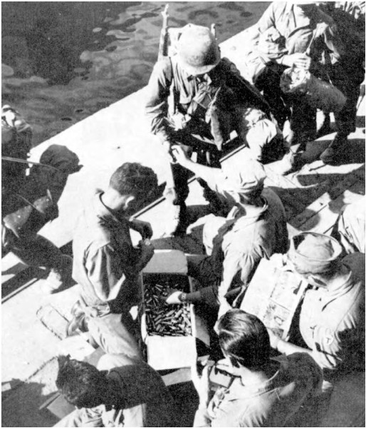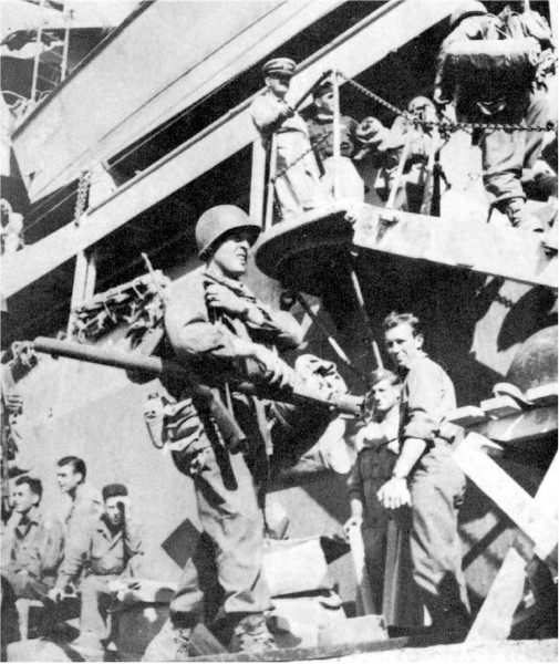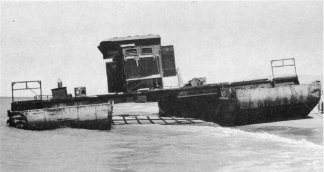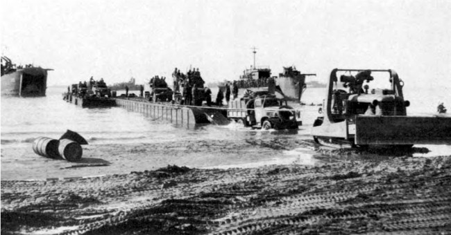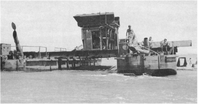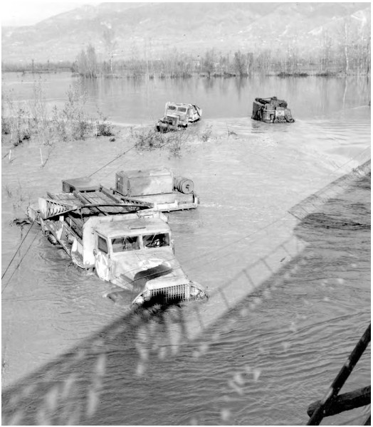 “ALLIGATORS” ABOUT TO CROSS PO RIVER near Ostiglia. Developed by the U. S. Navy, the first shipment of these amphibian tracked vehicles arrived in December 1944 and training was begun. Great secrecy surrounded them and they were kept thoroughly camouflaged before the dash to the Po. They were armored and each had socket mounts at four locations for either .30-or .50-caliber machine guns. A stern ramp could be lowered to take on a vehicle. Maximum capacity was 8,000 pounds and a crew of three. (LVT(4).)